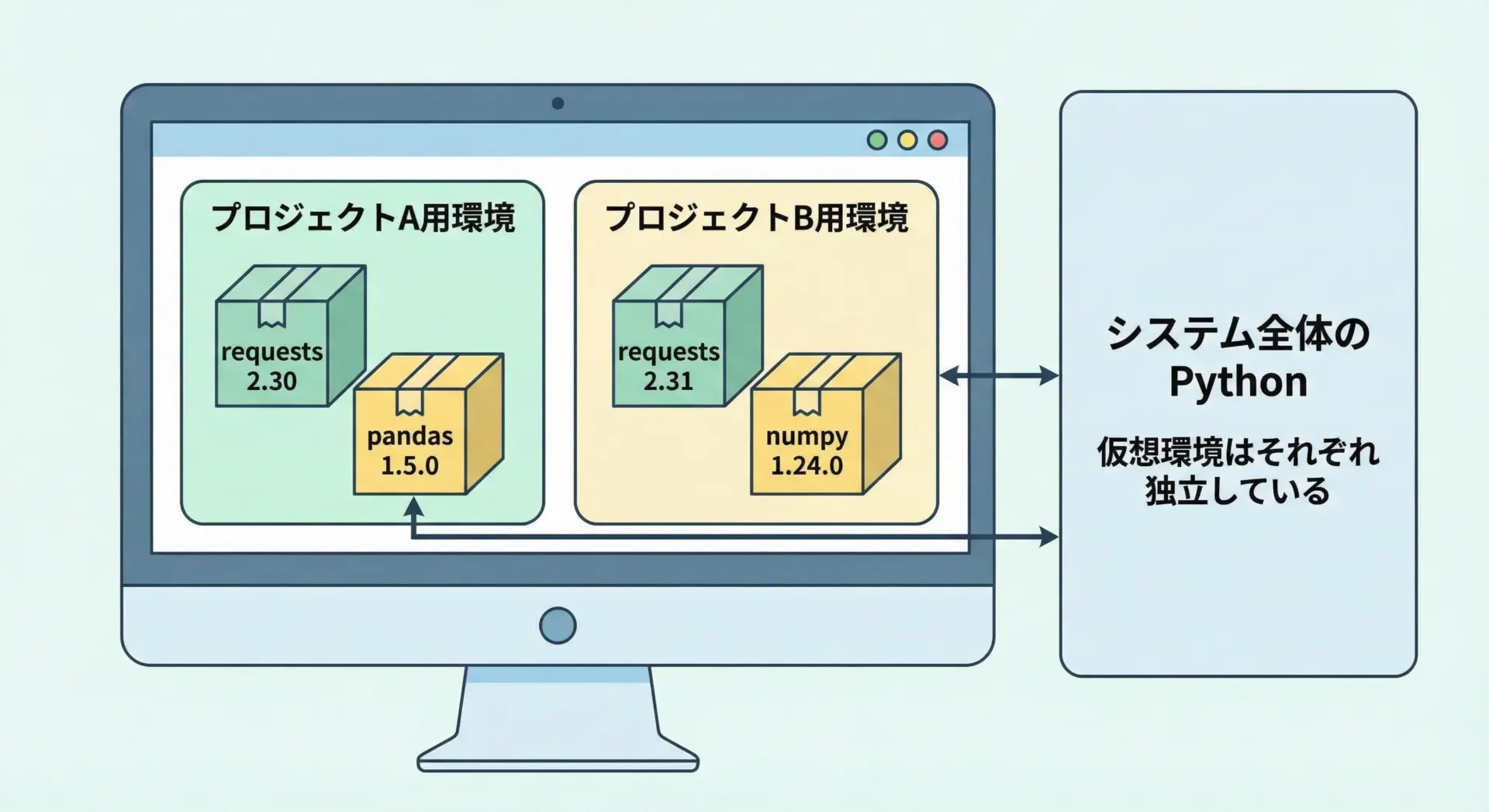 仮想環境とは、プロジェクトごとに独立したPythonとパッケージのセットを持てる仕組みです。