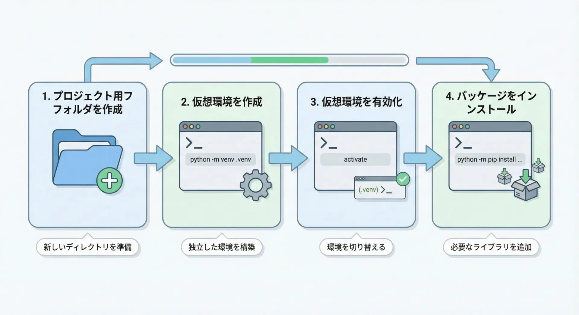 Python標準のvenvモジュールを使うと、追加ツールなしで仮想環境を作成できます。