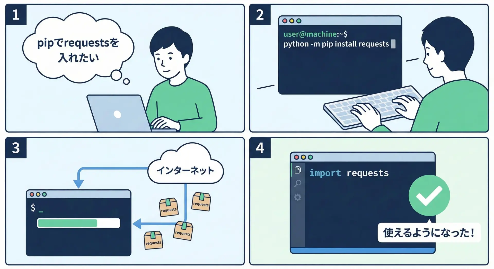 実行すると、pipがインターネット上のPyPI(Python Package Index)からrequestsをダウンロードし、現在の環境にインストールします。