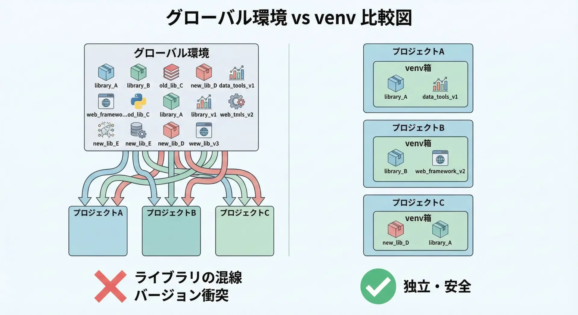 こうした点を意識しながら、基本的には「すべてのプロジェクトでvenvを使う」という運用にするとトラブルを減らせます。
