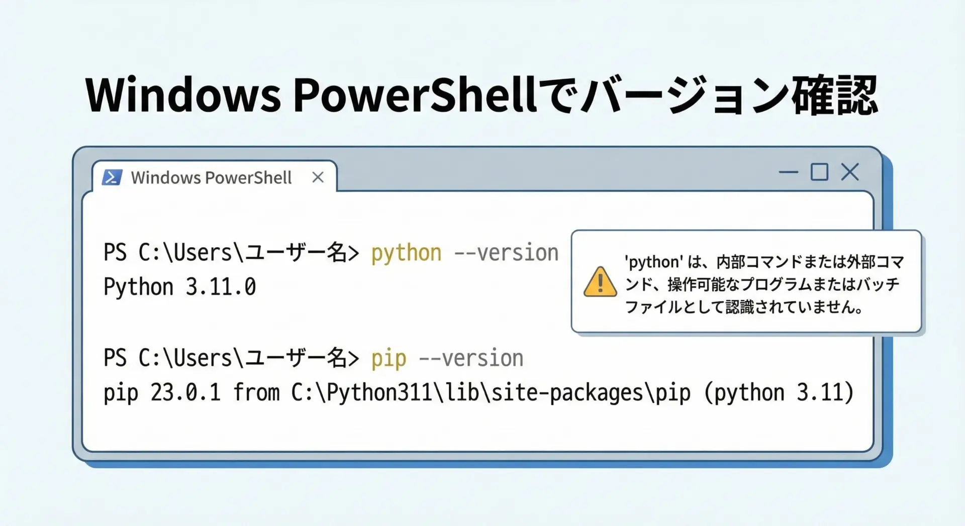 Windowsでは、最初にPythonとpipが正しくインストールされているか確認します。