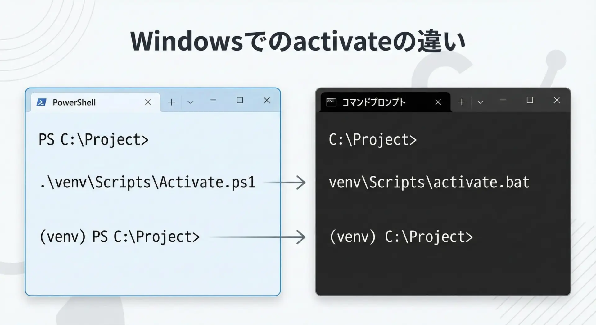 Windowsでは、シェルごとに有効化コマンドが異なる点に注意が必要です。