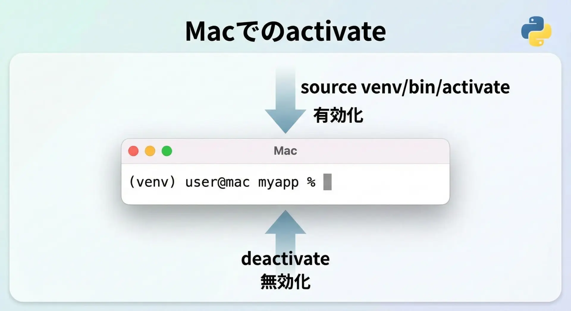 有効化(activate)すると、シェルやコマンドプロンプトがそのフォルダ内のPythonとpipを優先して使うようにパスを書き換えます。 - その状態で