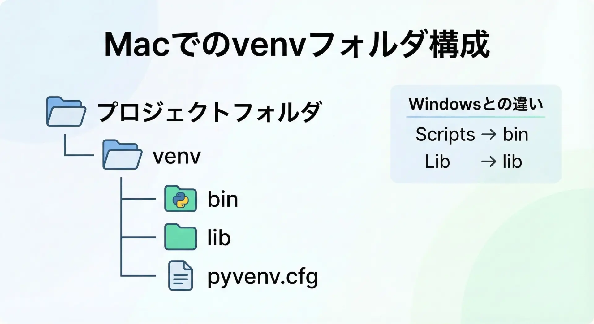 MacでもWindowsでも共通ですが、「プロジェクトフォルダの直下にvenvを置く」管理方法が一番わかりやすいです。