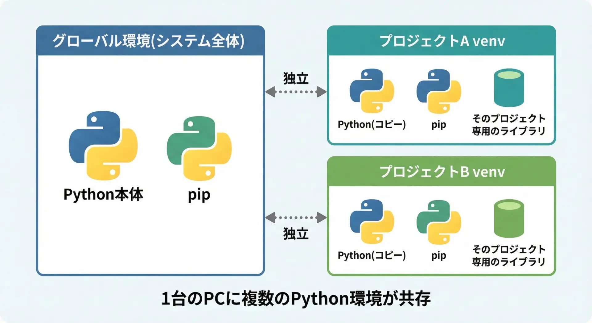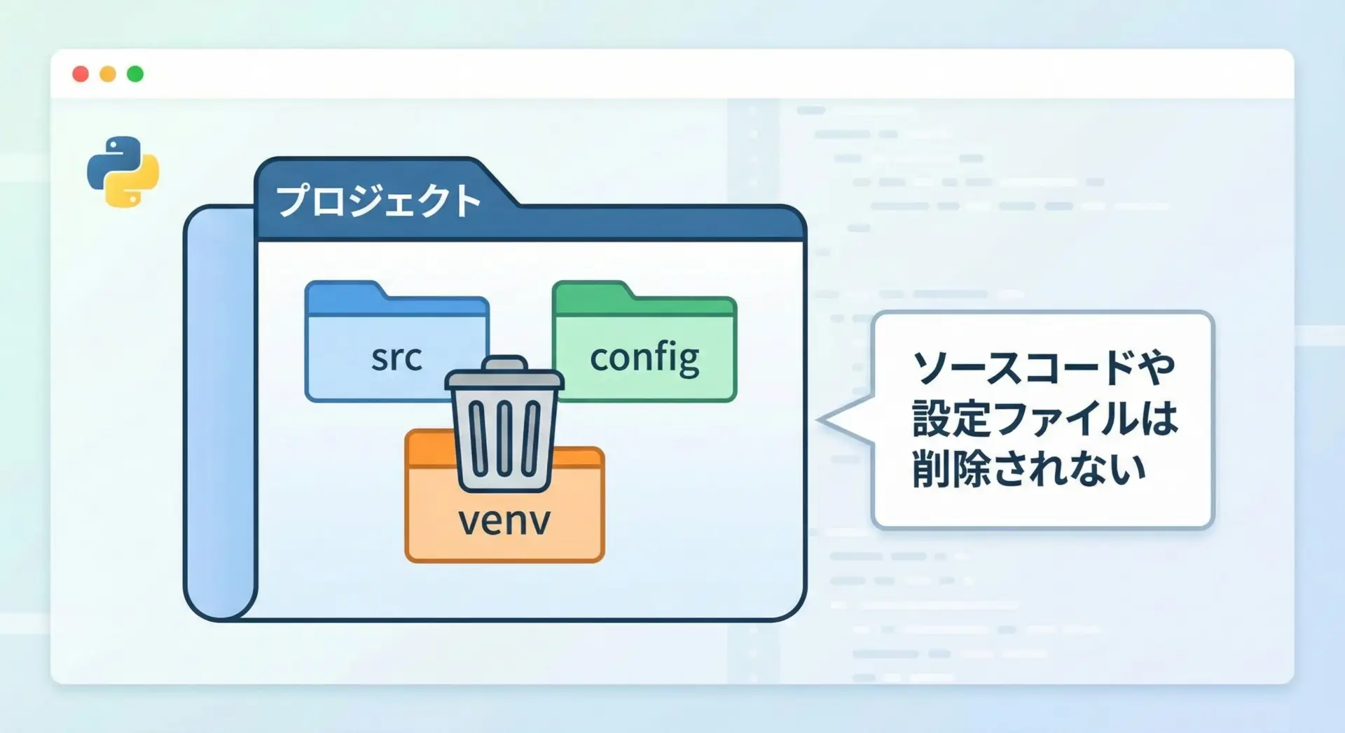 仮想環境を削除したくなったときも、venvフォルダを消すだけでクリーンに片付きます。