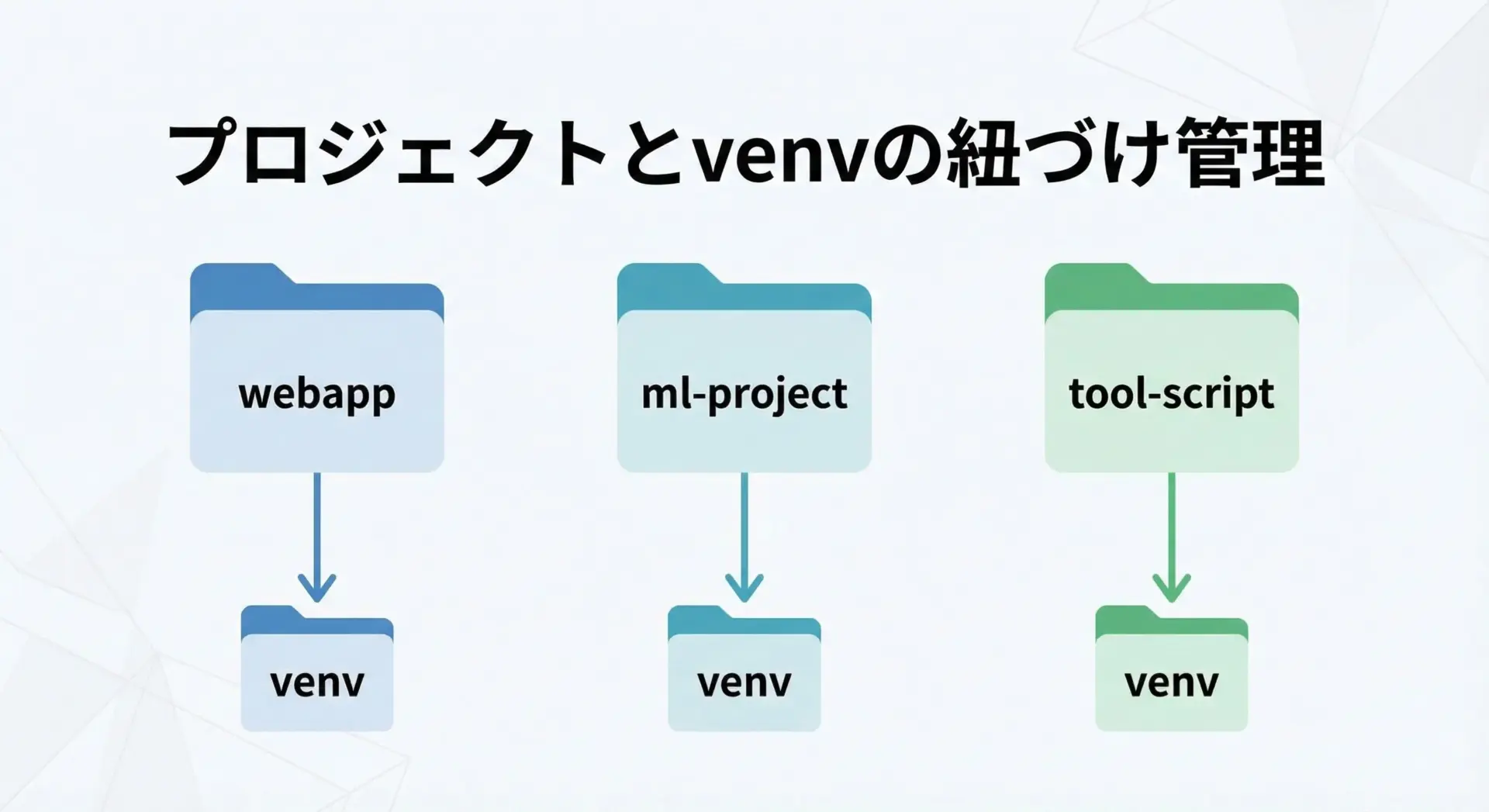 1プロジェクト1venvを徹底すると、「このプロジェクトはどの環境で動いていたか」が明確になり、後から見直したときにも混乱しにくくなります。