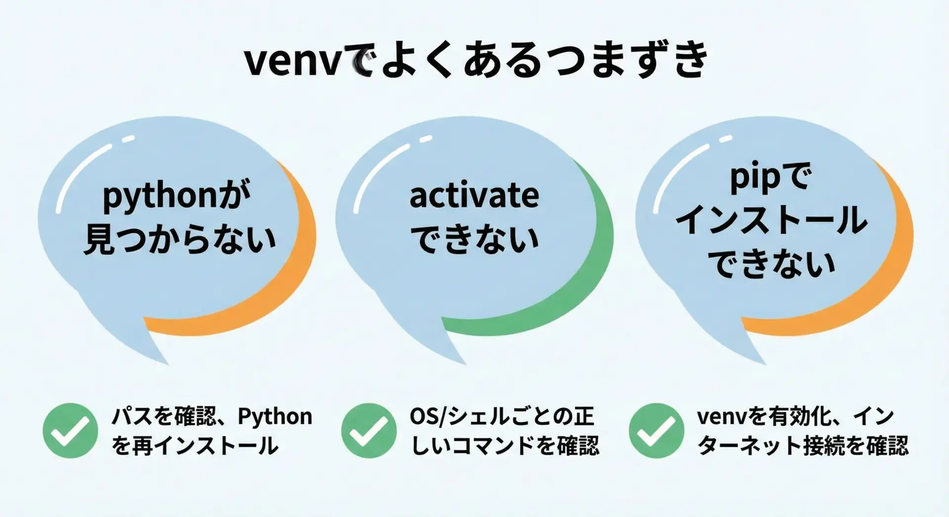 venvを使っていると、いくつか典型的なエラーに遭遇します。