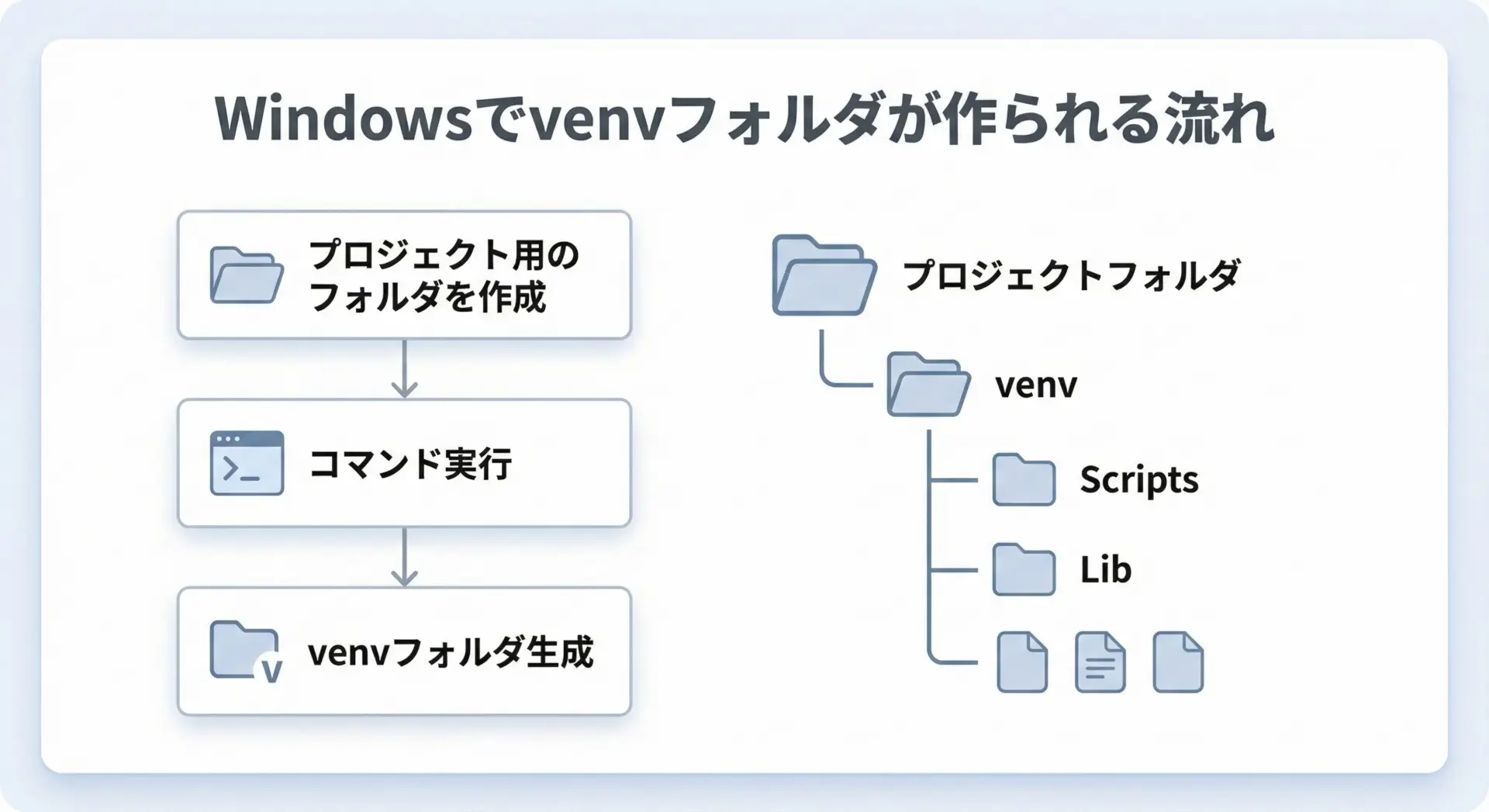 このコマンドを実行すると、現在のフォルダの中にvenvというフォルダが作成され、その中にWindows用のScriptsフォルダやLibフォルダが生成されます。