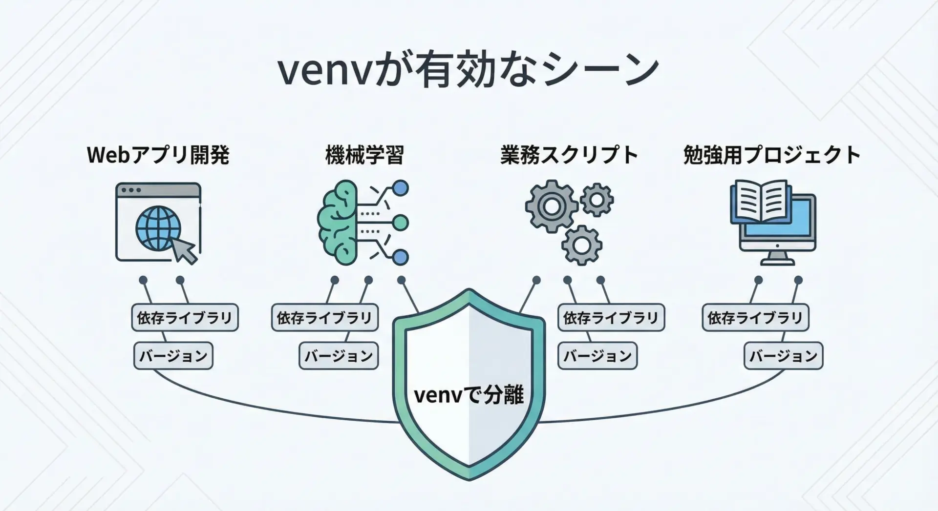 次のようなケースでは、基本的に必ずvenvを使うべきです。