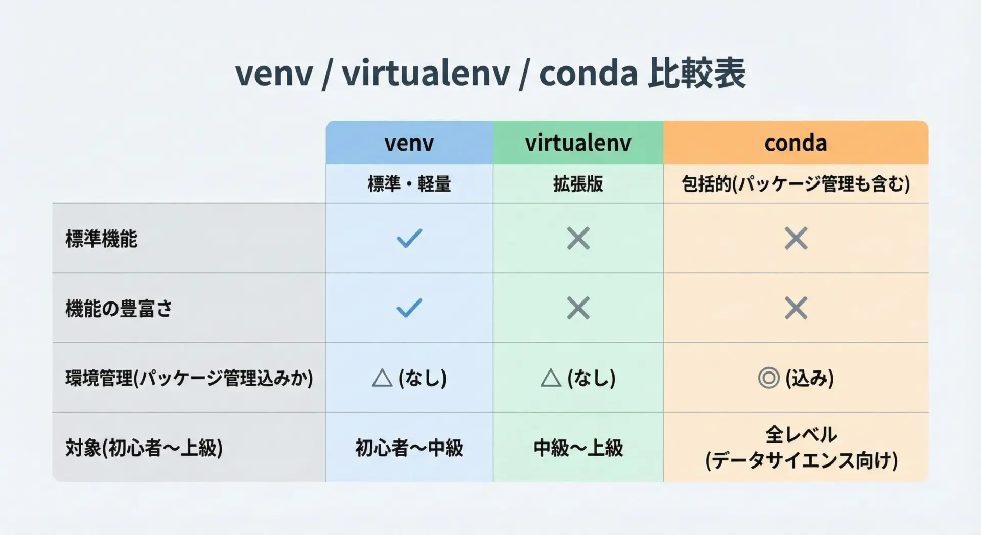 | venv | Python標準 | 軽量・標準ライブラリ / 追加インストール不要 | 一般的なPython開発全般、学習用途 |