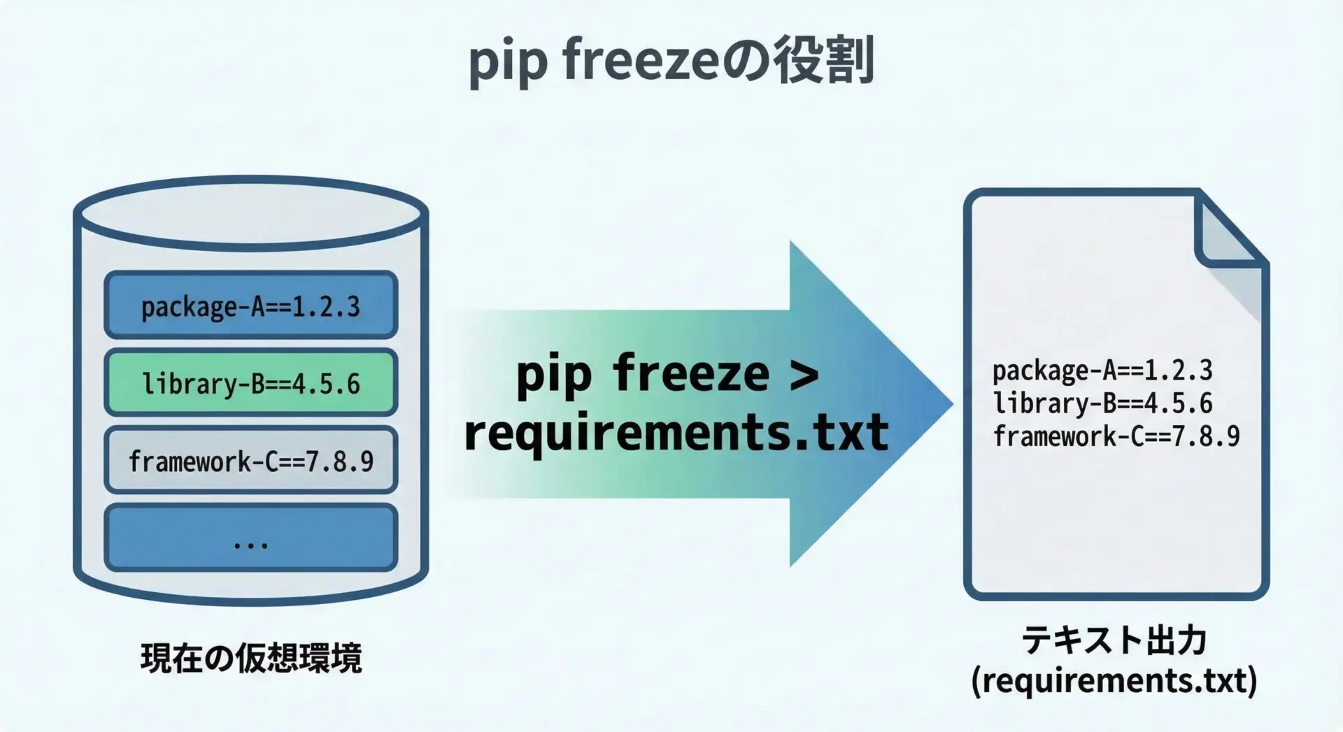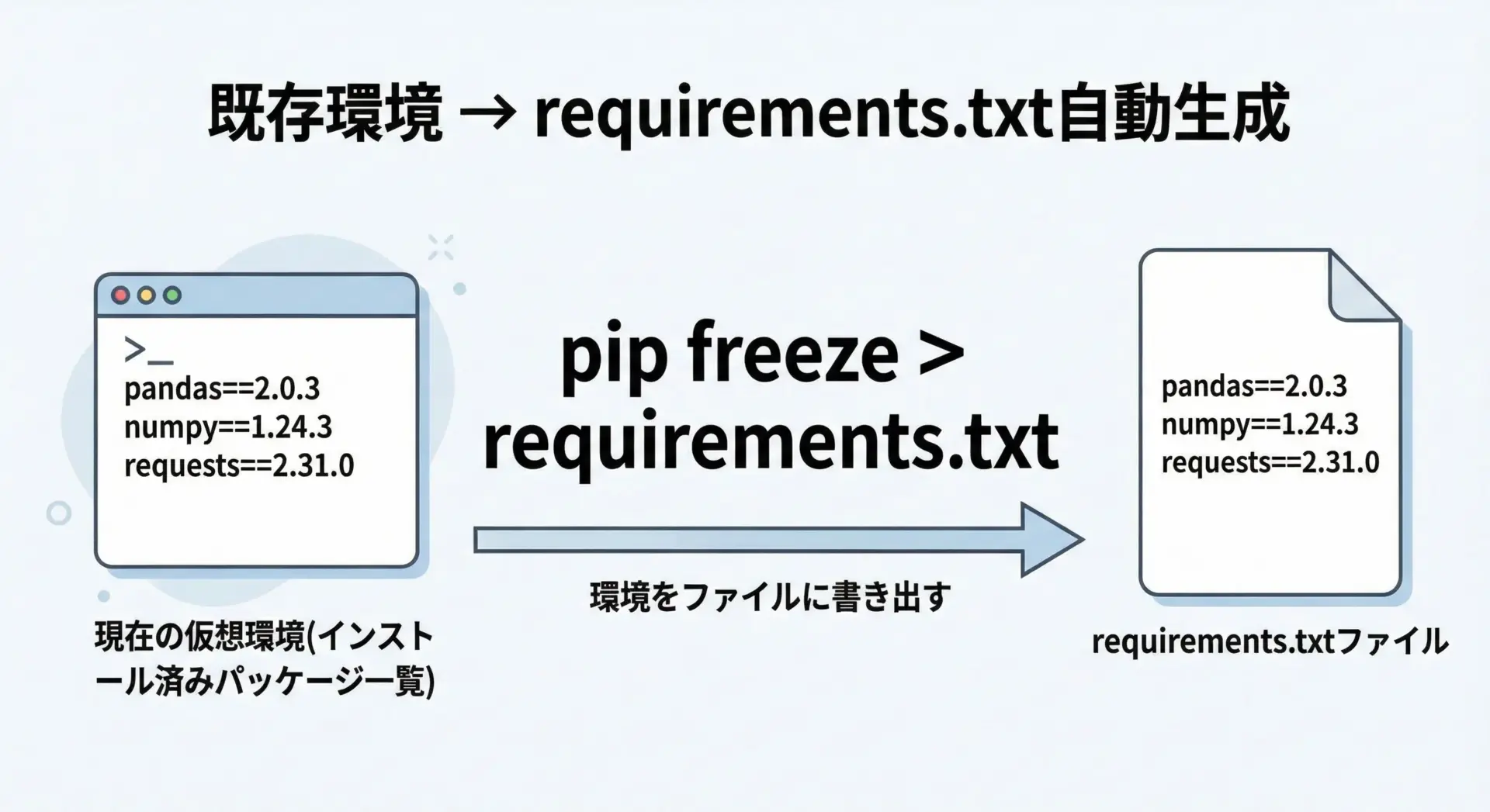 venvによる仮想環境と組み合わせれば、pipコマンド1つで開発環境や本番環境を同じ状態に整えることができます。