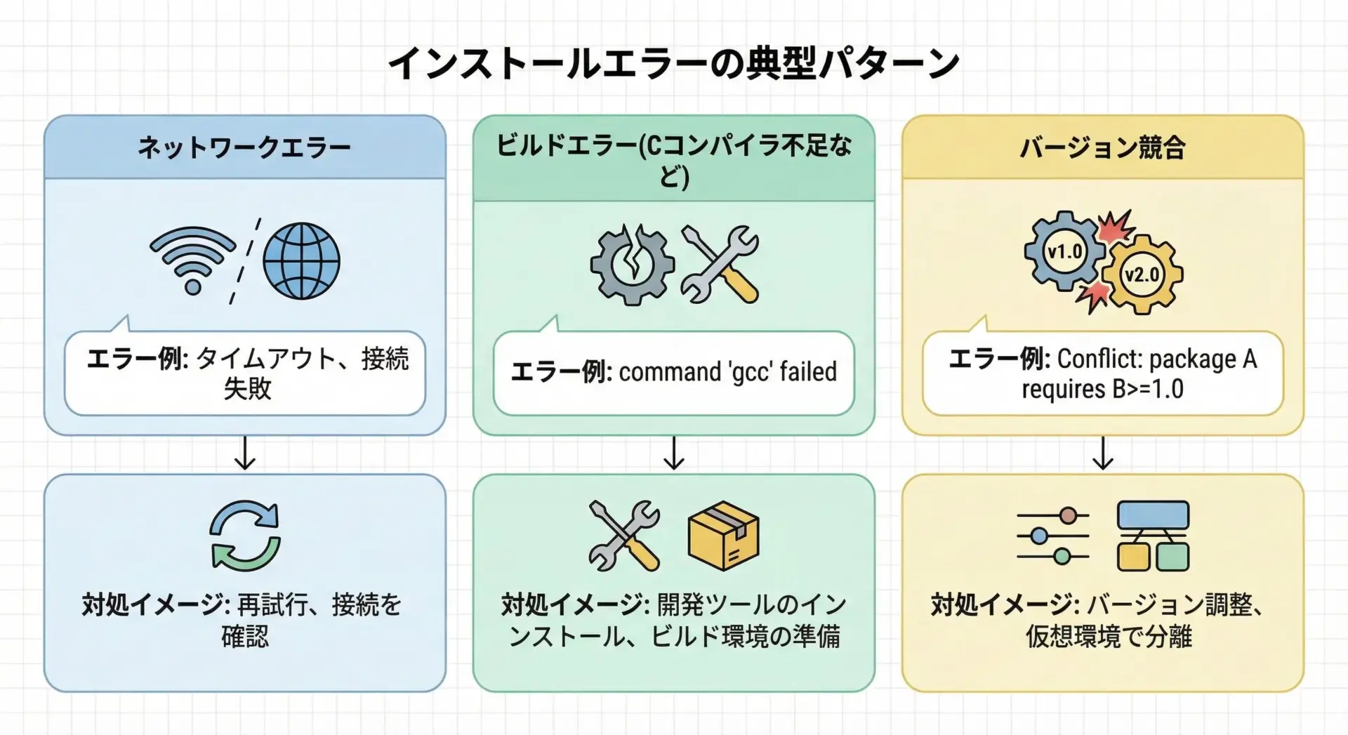 エラーが出たときは、まずエラーメッセージの最下部付近をよく読み、「どのパッケージで」「どのような理由で」失敗しているのかを特定することが重要です。