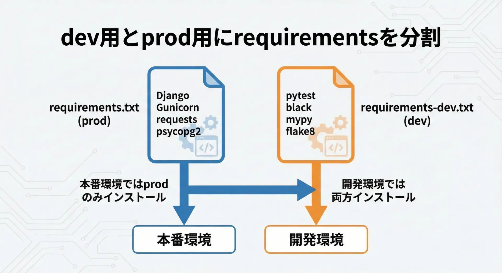 requirements.txt: 本番環境でも必要な共通パッケージrequirements-dev.txt: 開発専用パッケージ(テストや開発支援ツールなど)