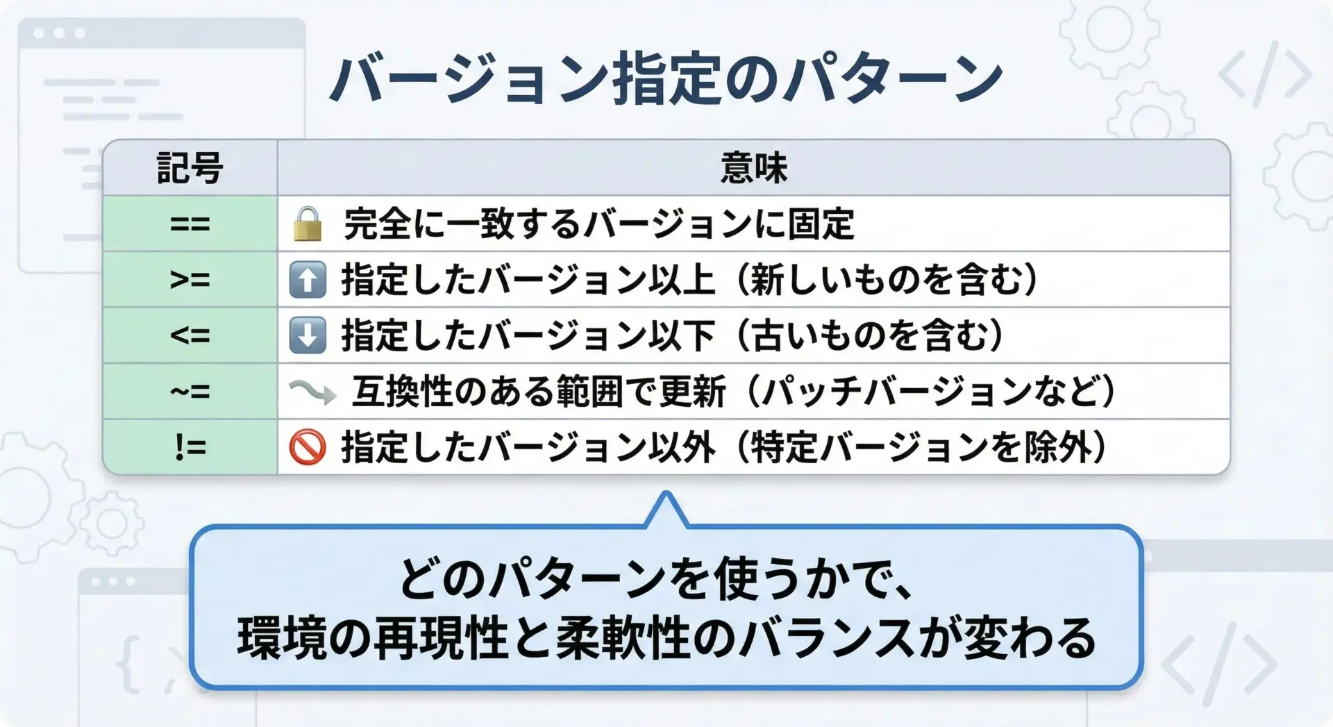 バージョン指定は環境の再現性に直結するため、「どの記号を使うか」を理解しておくことが重要です。