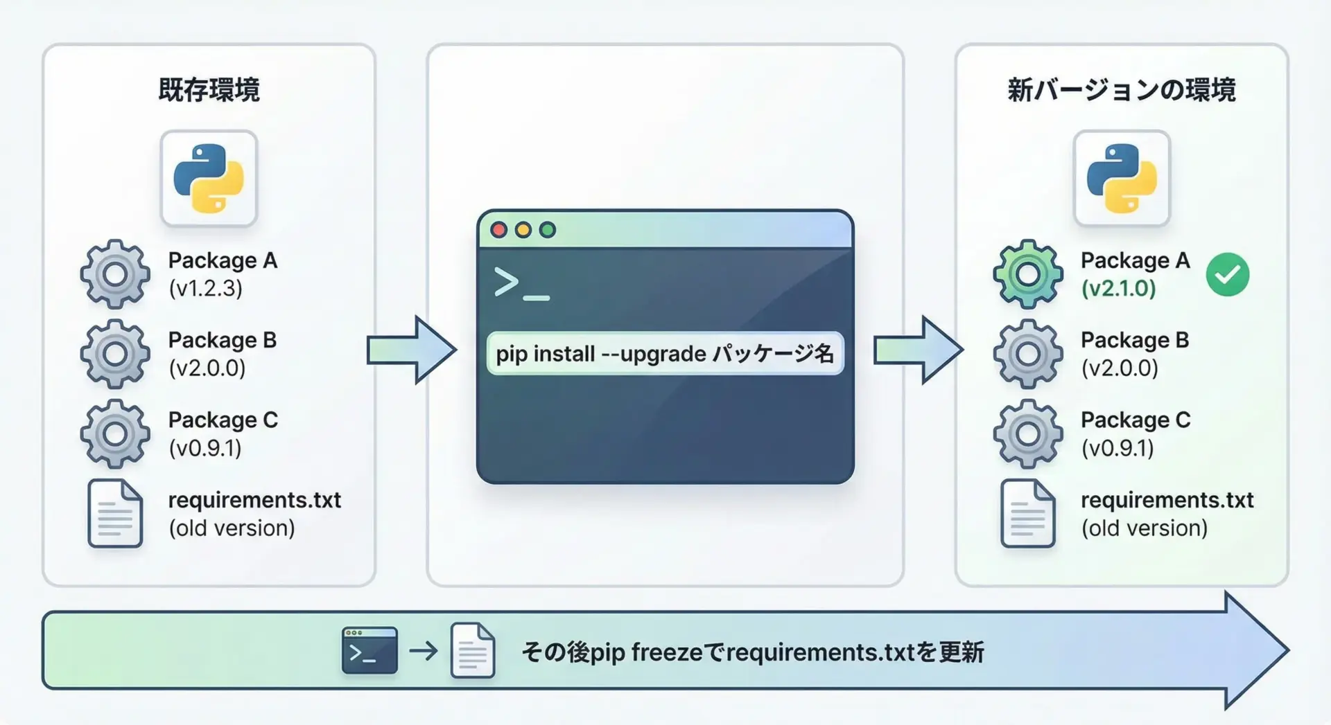 アップグレード後は、必ず動作確認を行い、そのうえでpip freezeでrequirements.txtを更新するとよいでしょう。
