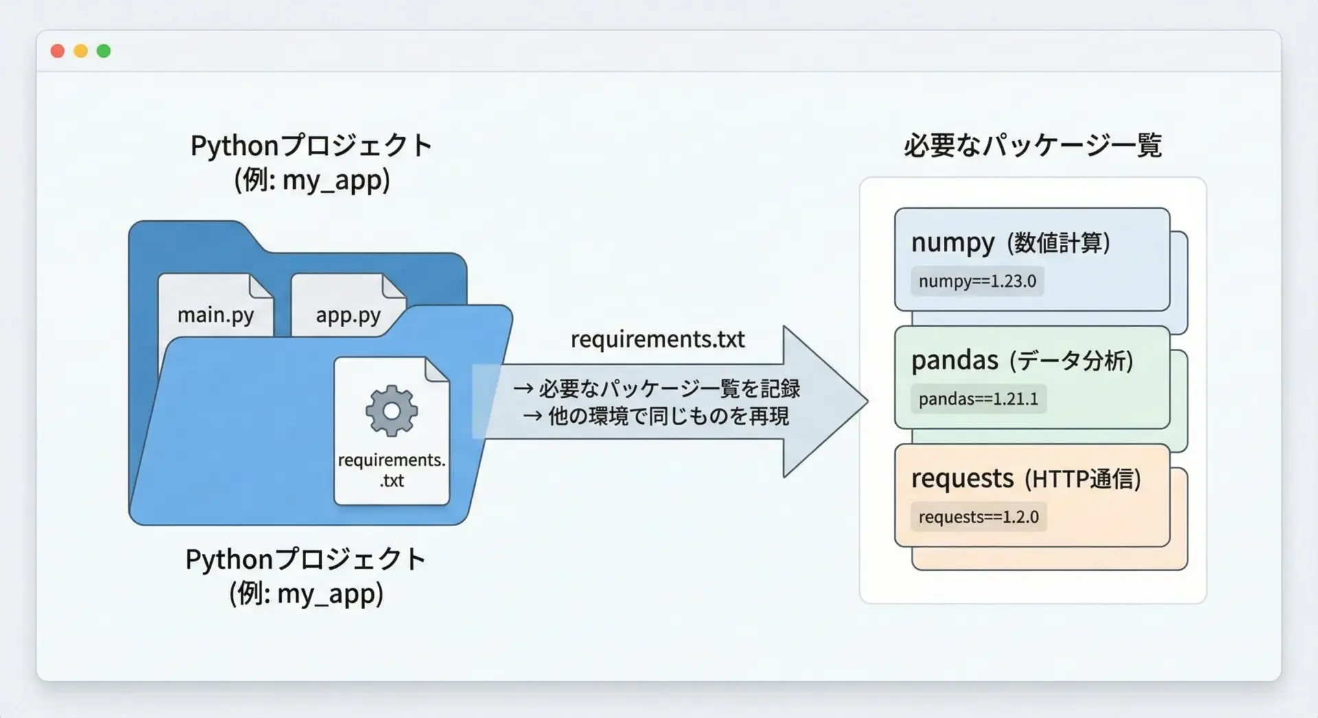 requirements.txtを使う主な目的を、文章で整理しておきます。