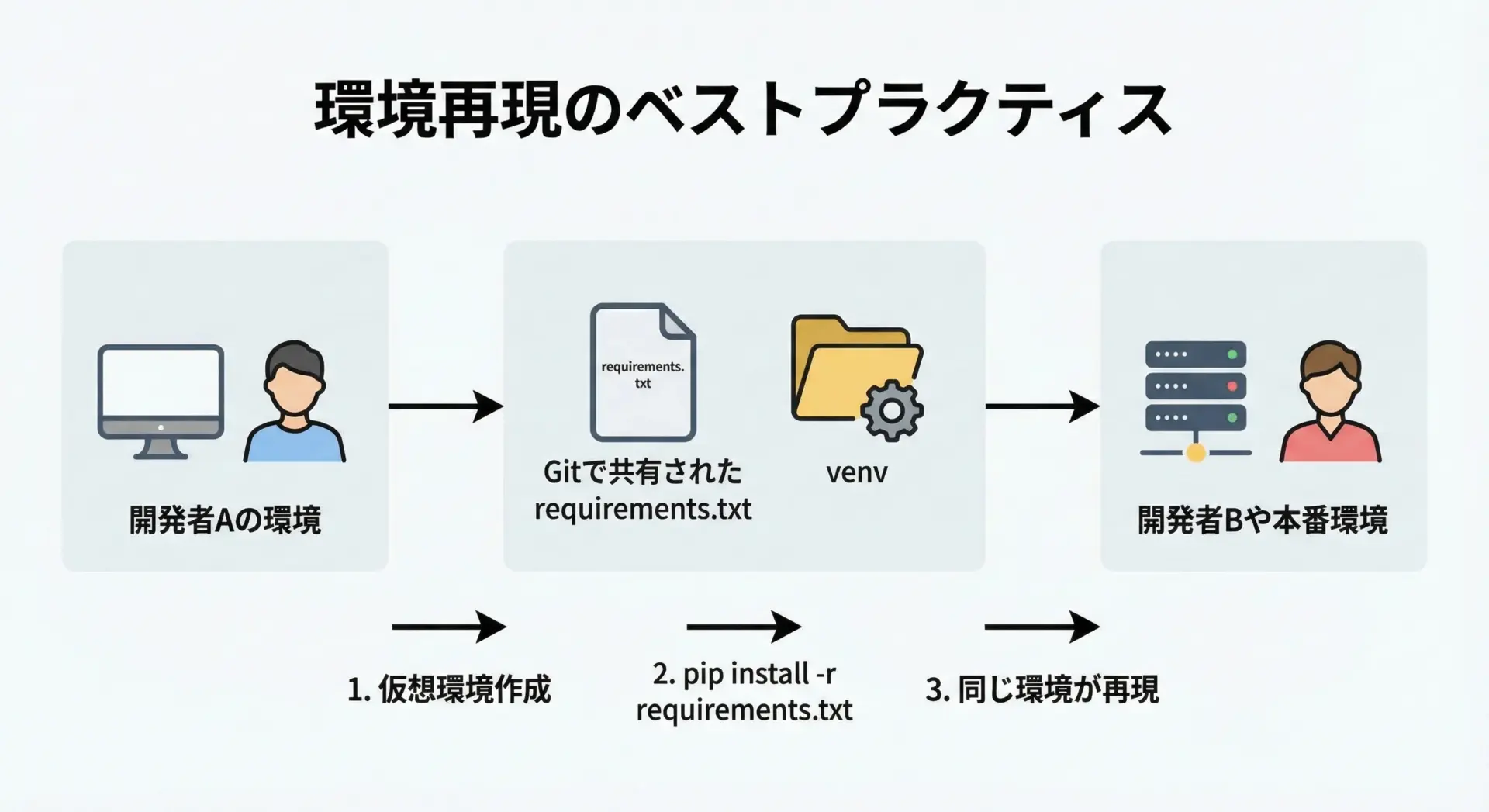 さらに、本番環境やステージング環境でのデプロイ時にも、同じrequirements.txtを用いることで、「開発環境と本番環境の差異」を減らすことができます。