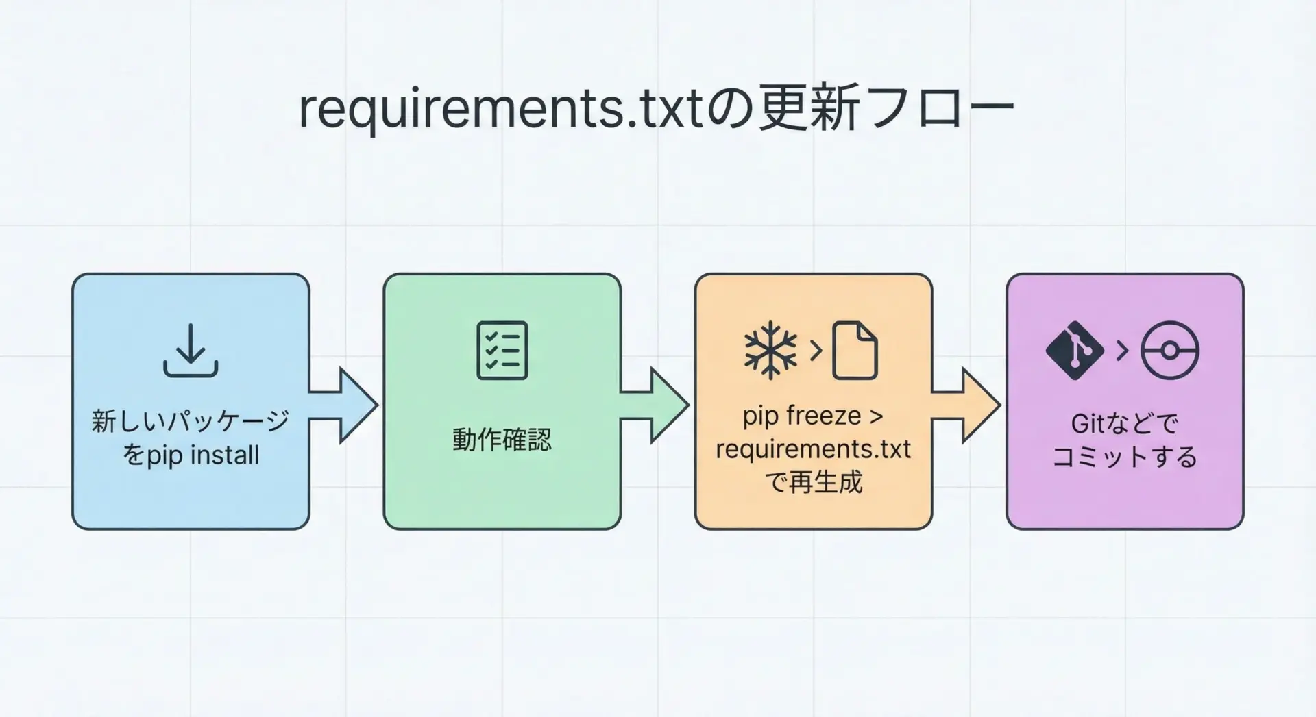 新しいパッケージをインストールしたあと、あるいはアップグレードを行ったあとには、pip freezeで再生成し、バージョン管理システムにコミットしておくことで、「誰がいつ、どのライブラリを追加・変更したのか」が履歴として残ります。