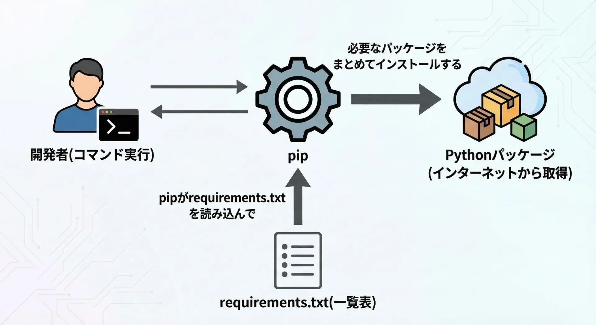 開発者は、コマンドラインからpipに対して-r requirements.txtという形でファイルを指定し、pipはその内容を1行ずつ解釈して、該当するパッケージを順にインストールしていきます。