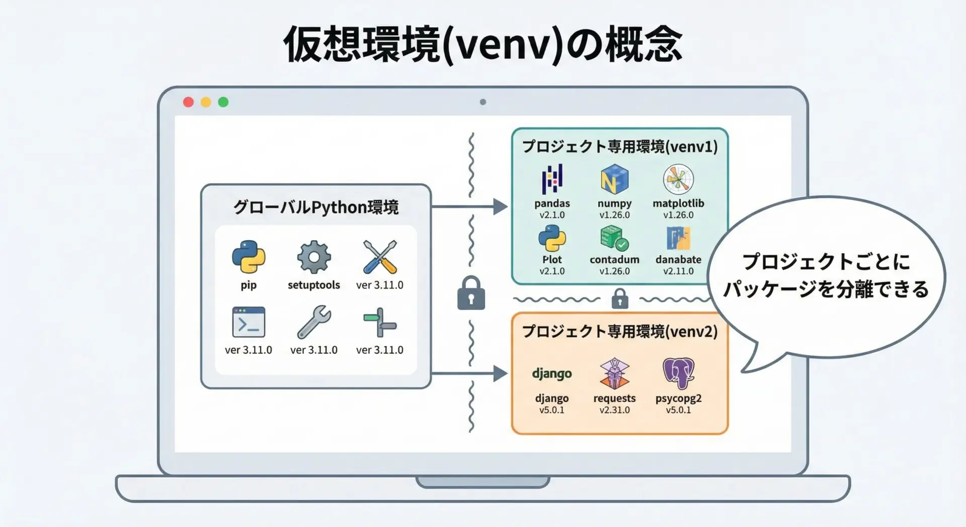 仮想環境とは、1台のPCの中にプロジェクトごとに独立したPython環境を作る仕組みで、パッケージのバージョンや構成をプロジェクト単位で管理できます。