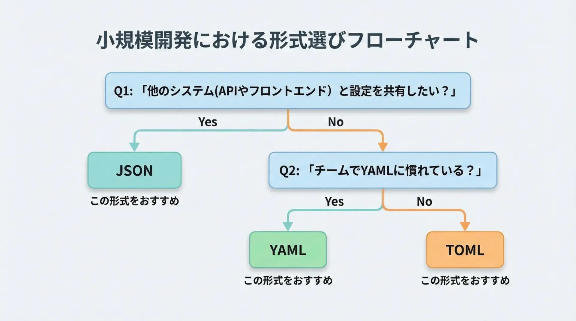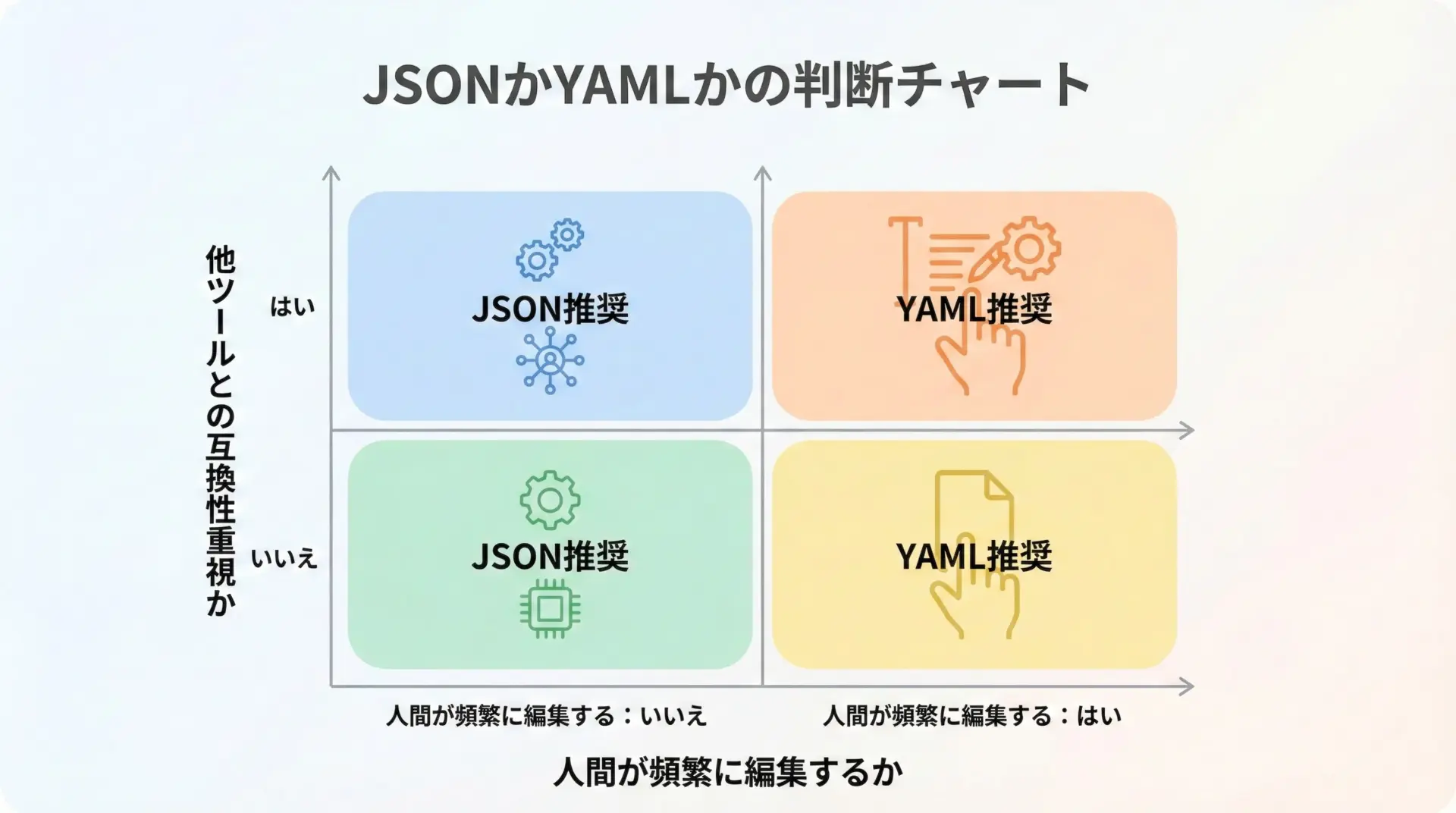 JSONを選ぶとよいケースは、フロントエンドや他言語のサービスと設定を共有したい場合や、すでに周辺ツールがJSON前提で動いている場合です。