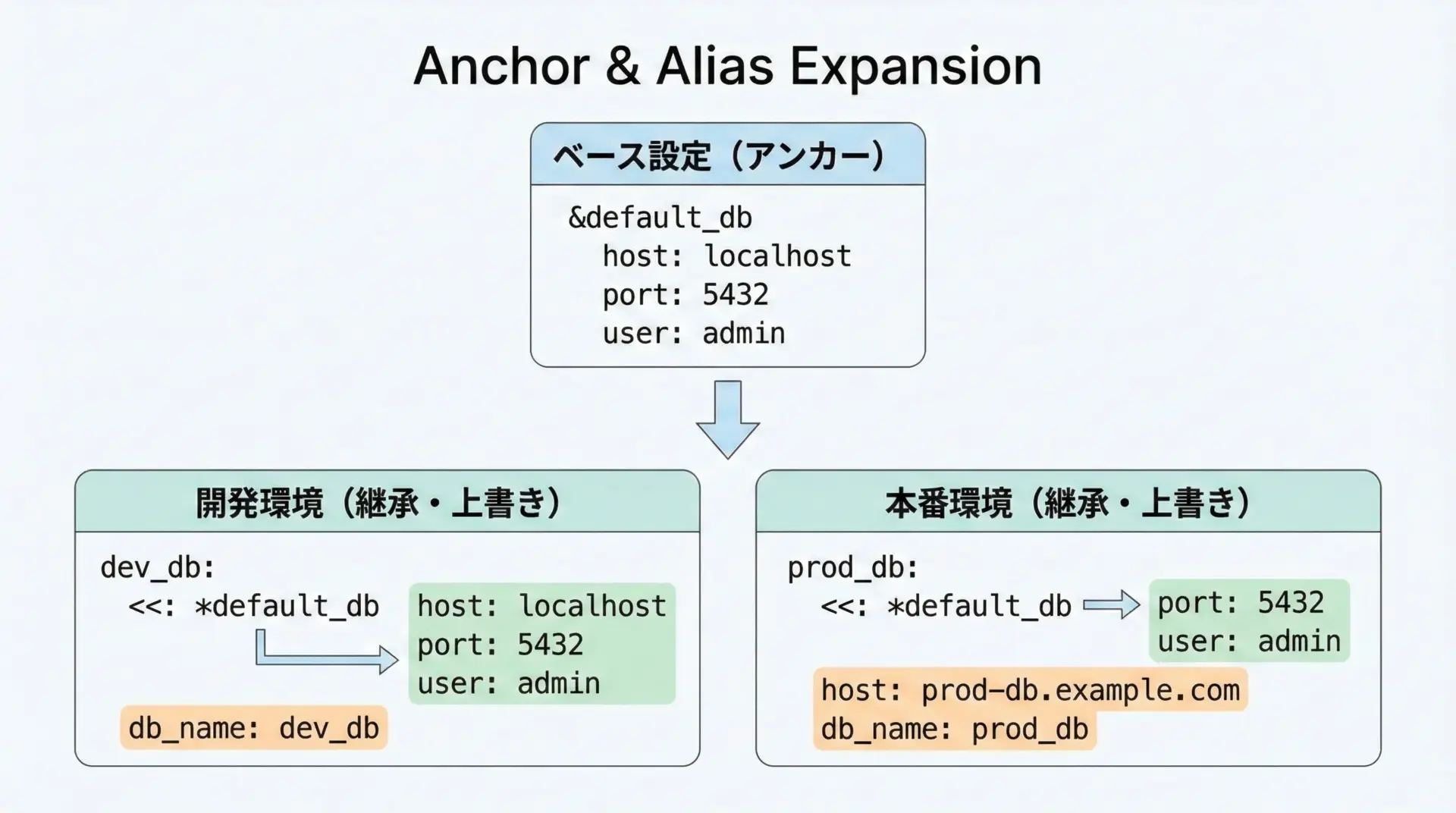 コメントを書き込みたい場合や、アンカーによる再利用で重複を減らしたい場合もYAMLが向いています。
