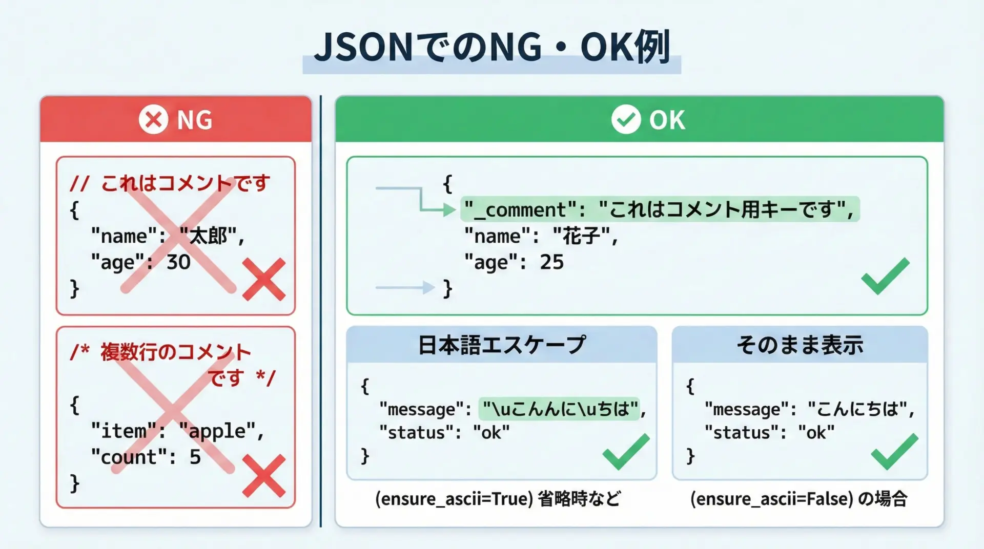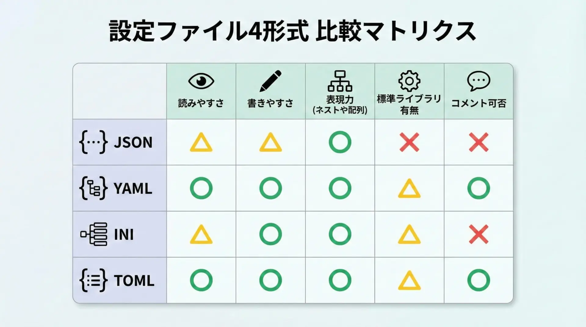 | 形式 | Python標準対応 | コメント | ネスト/配列 | 読みやすさ | 主な用途 |