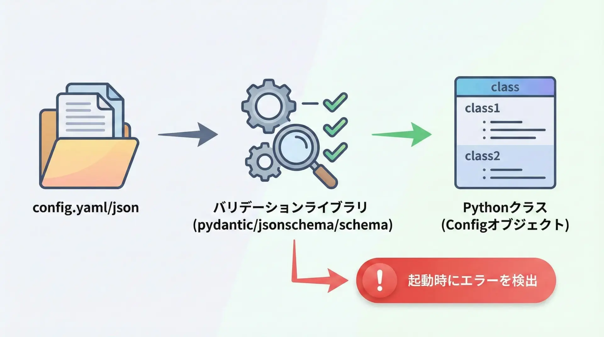 設定ファイルは柔軟である一方、誤った値や不足した必須項目があっても、そのままアプリケーションが動き始めてしまうリスクがあります。