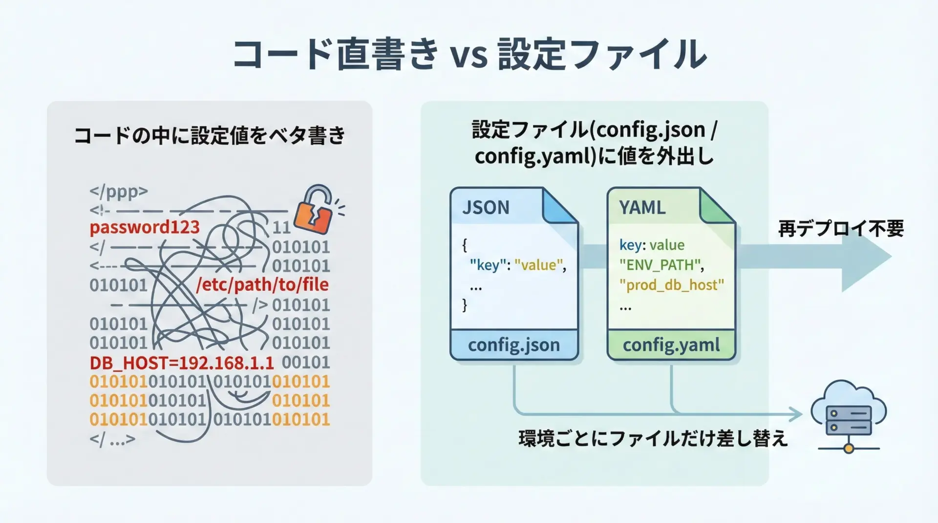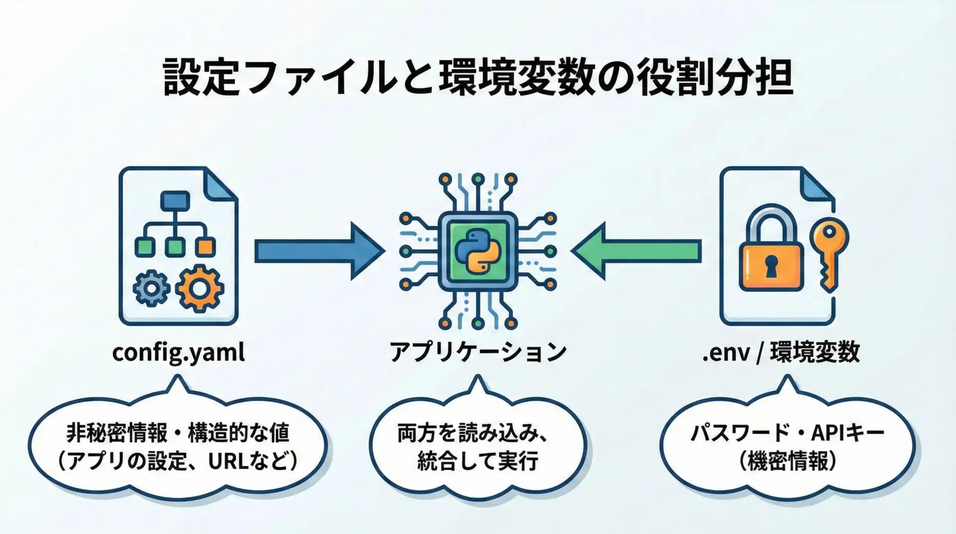 このように構造的で非秘密な情報はJSON/YAML、秘密情報は環境変数と役割を分けることで、安全かつ柔軟な設定管理が可能になります。