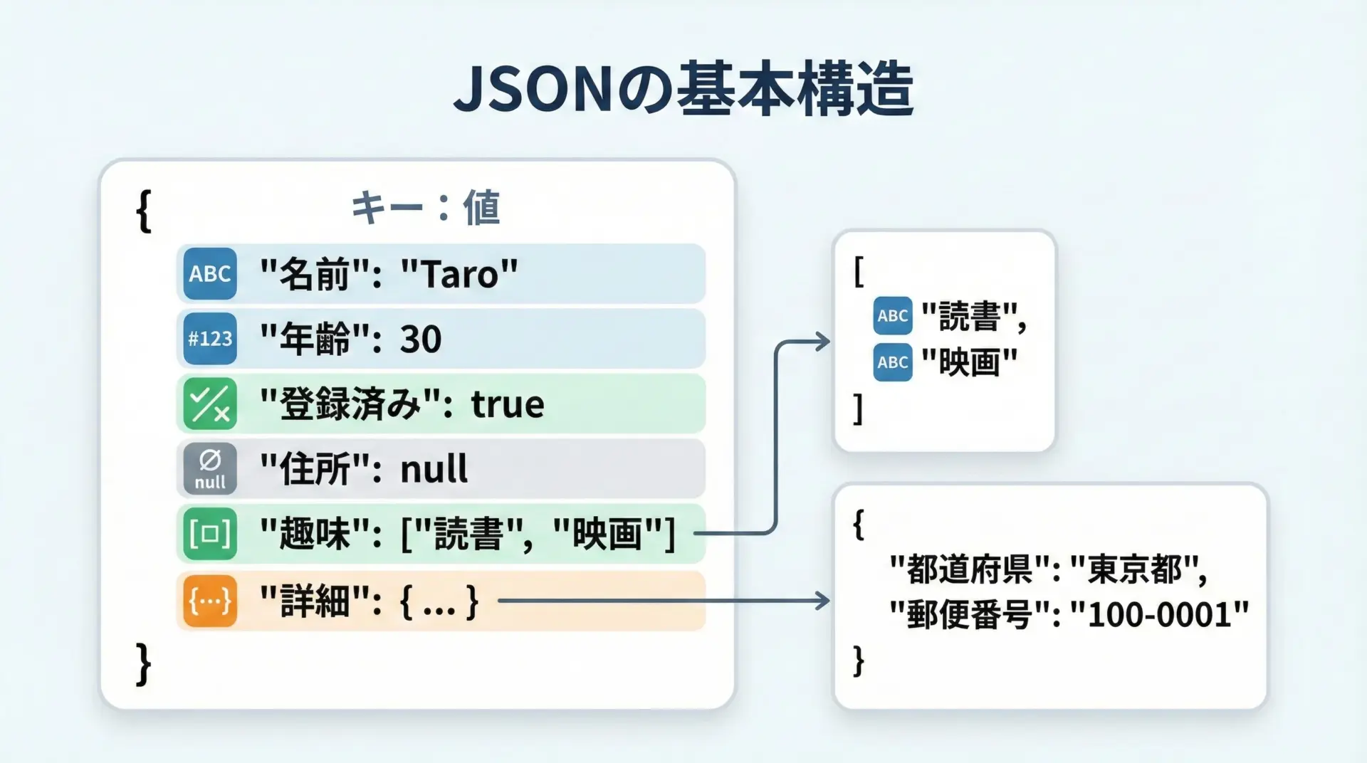 JSONで使える主な値の種類は、文字列・数値・真偽値・null・配列・オブジェクトです。