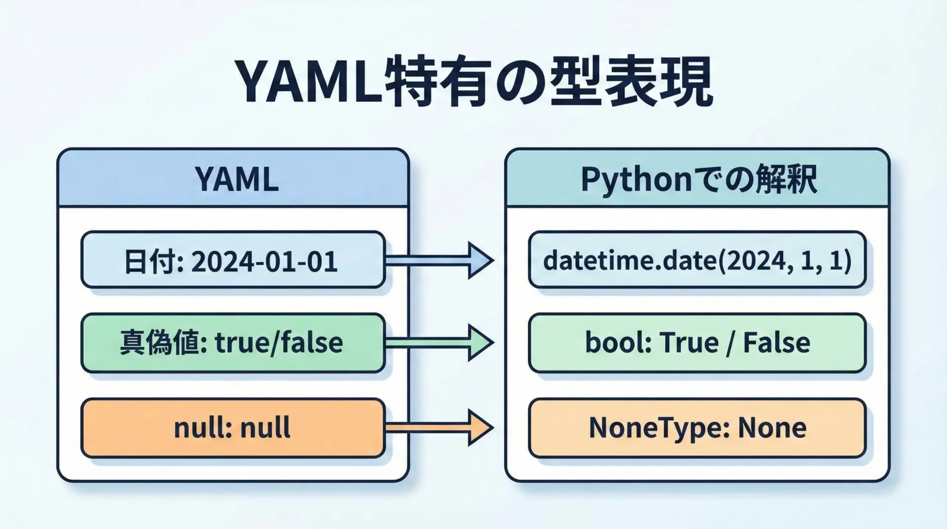 ただしパーサの実装によってはセキュリティリスクがあるため、Pythonではyaml.safe_loadのような安全な読み込みが推奨されます。