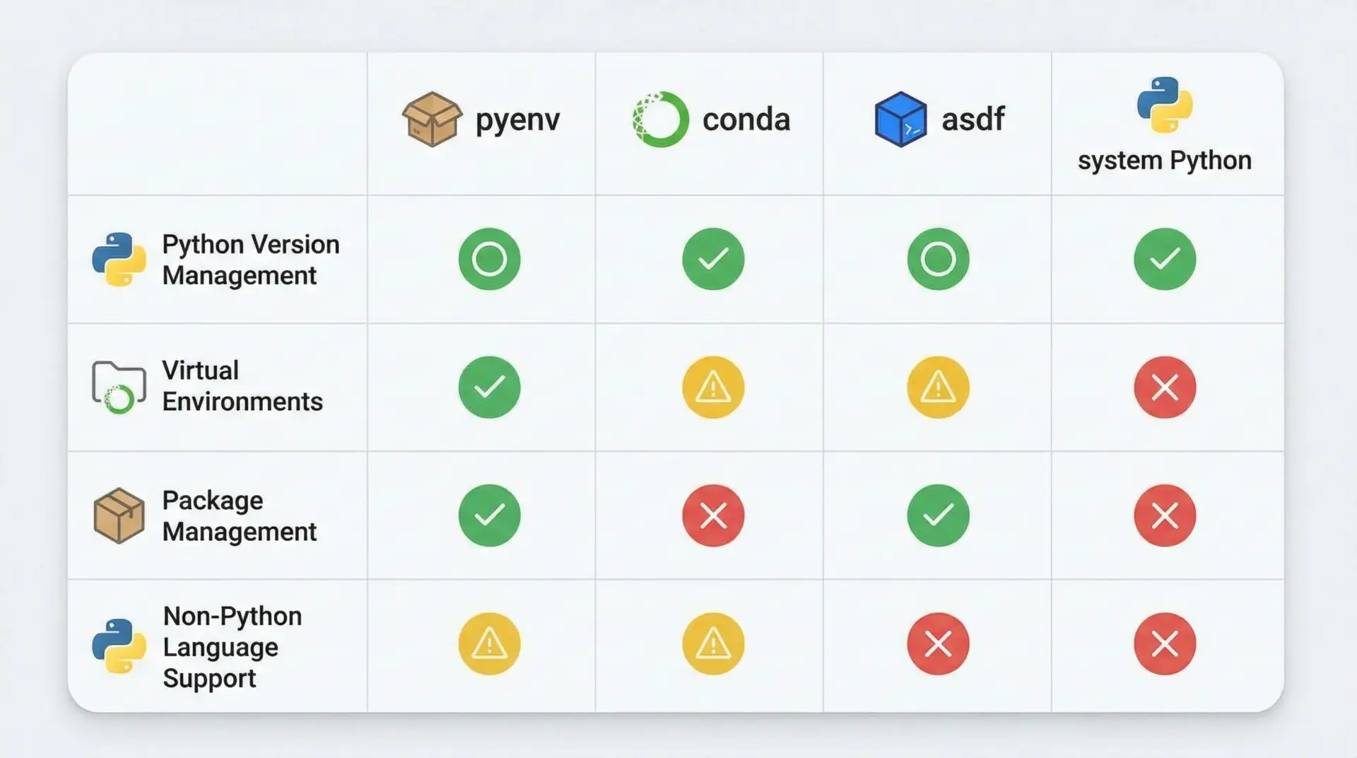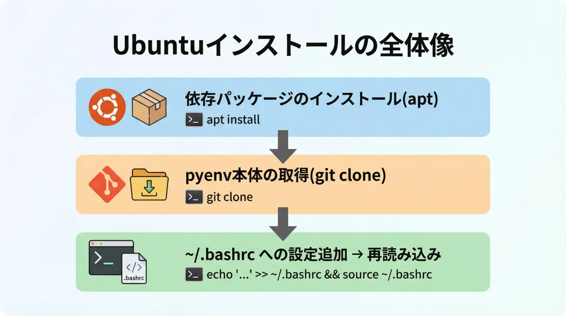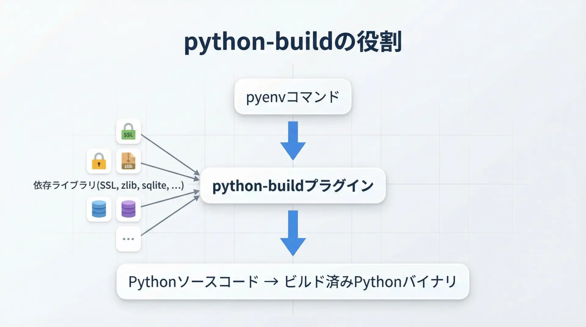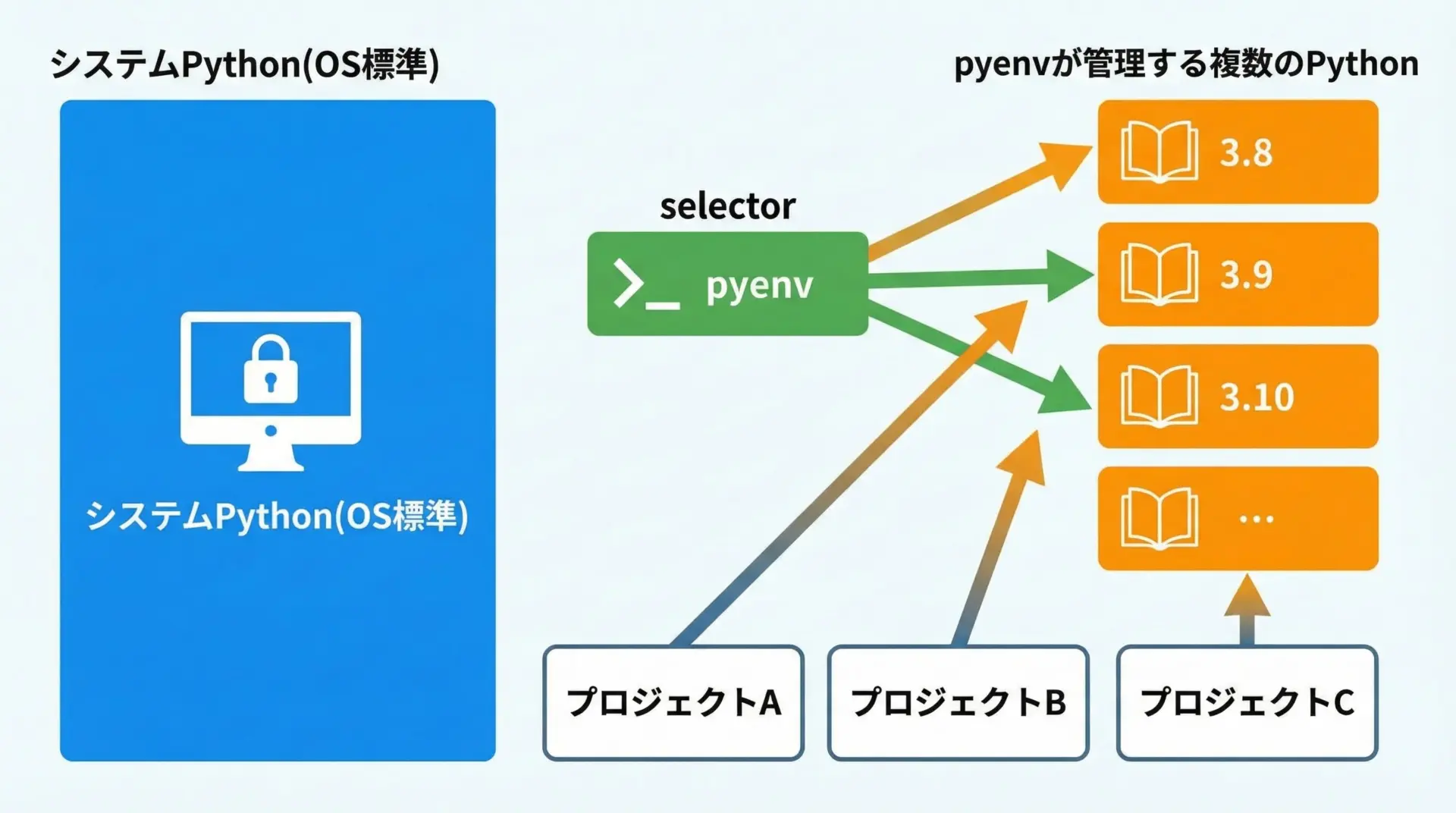 OS標準のPythonに手を加えることなく、任意のバージョンをユーザー領域にインストールし、簡単に切り替えられるようにしてくれます。