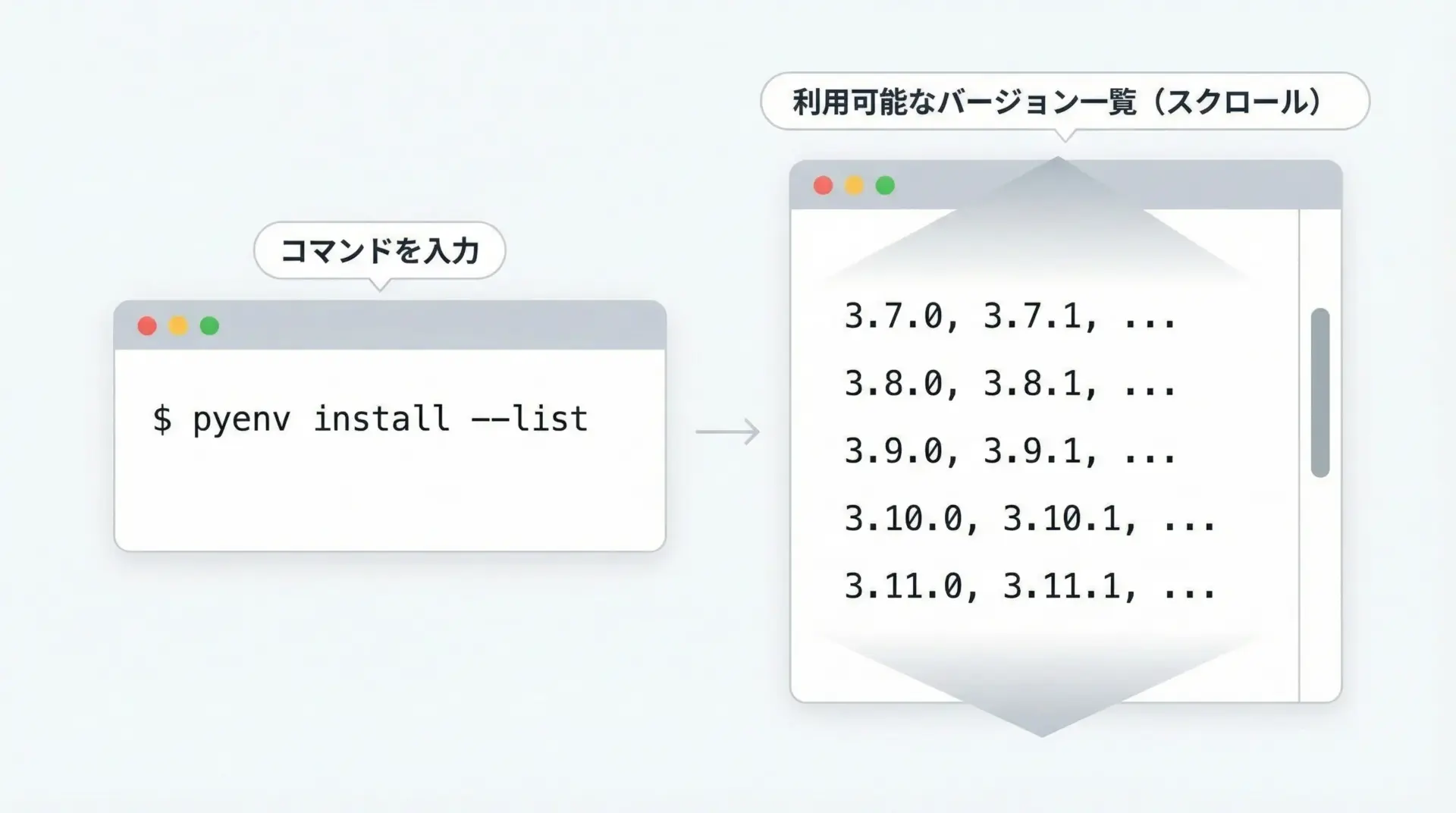 問題なくバージョン一覧などが表示されれば、macOSでのpyenv導入は完了です。