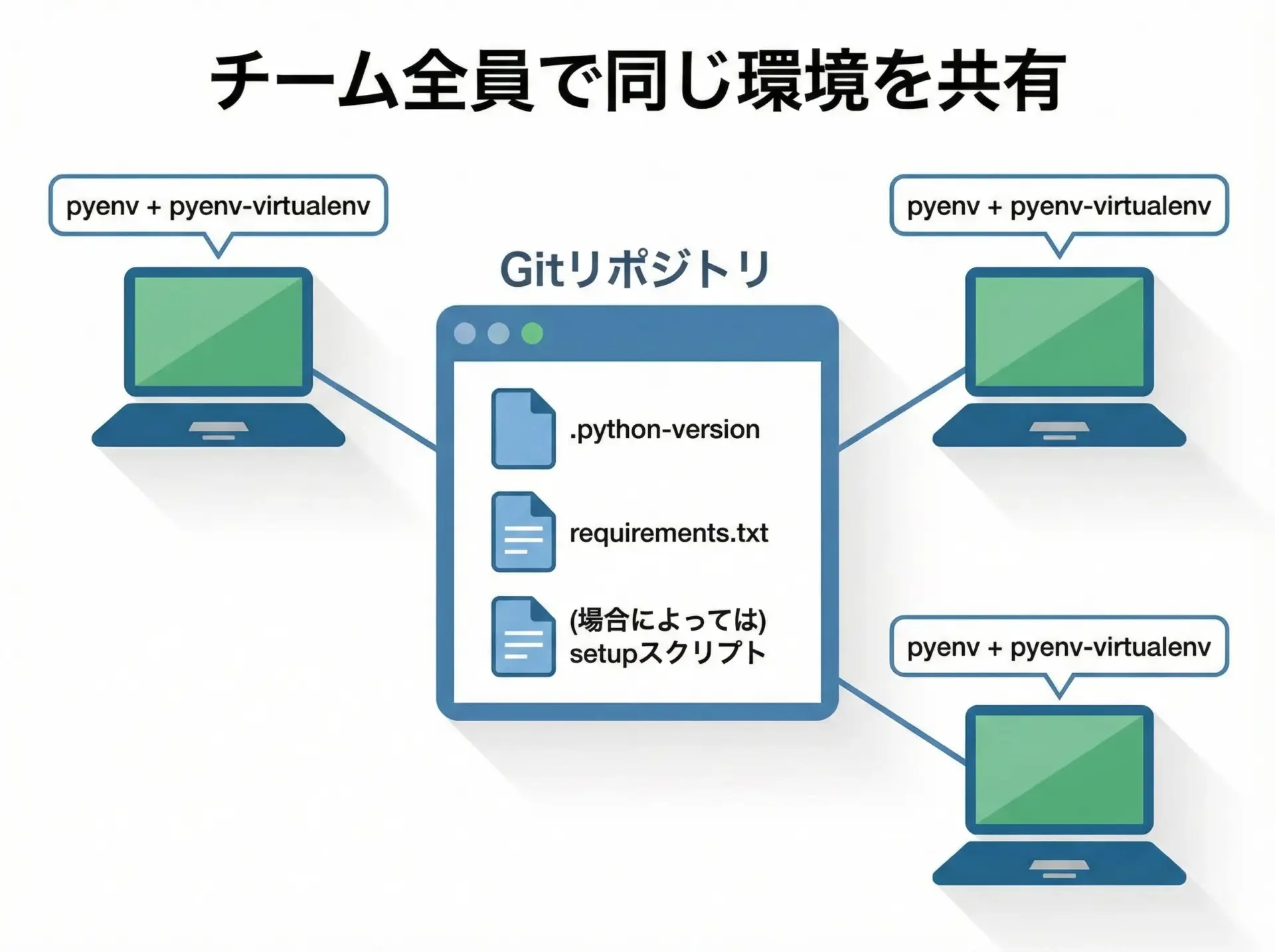 これらを整備しておくと、新メンバーが参加した際にも、短時間で同一のPython実行環境を再現でき、環境差異によるバグや「自分の環境では動く」問題を大幅に減らせます。