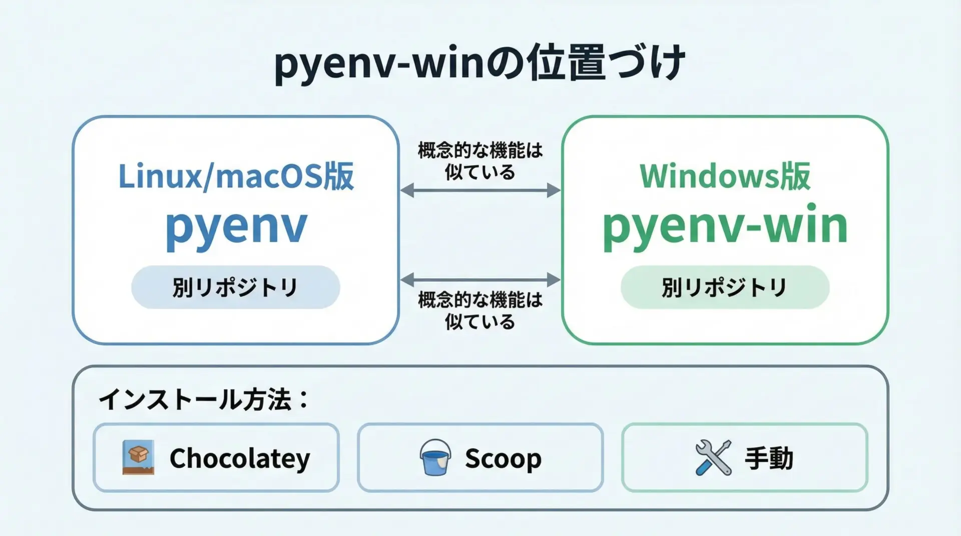 pyenvは「Python本体のバージョン」を管理するツールです。