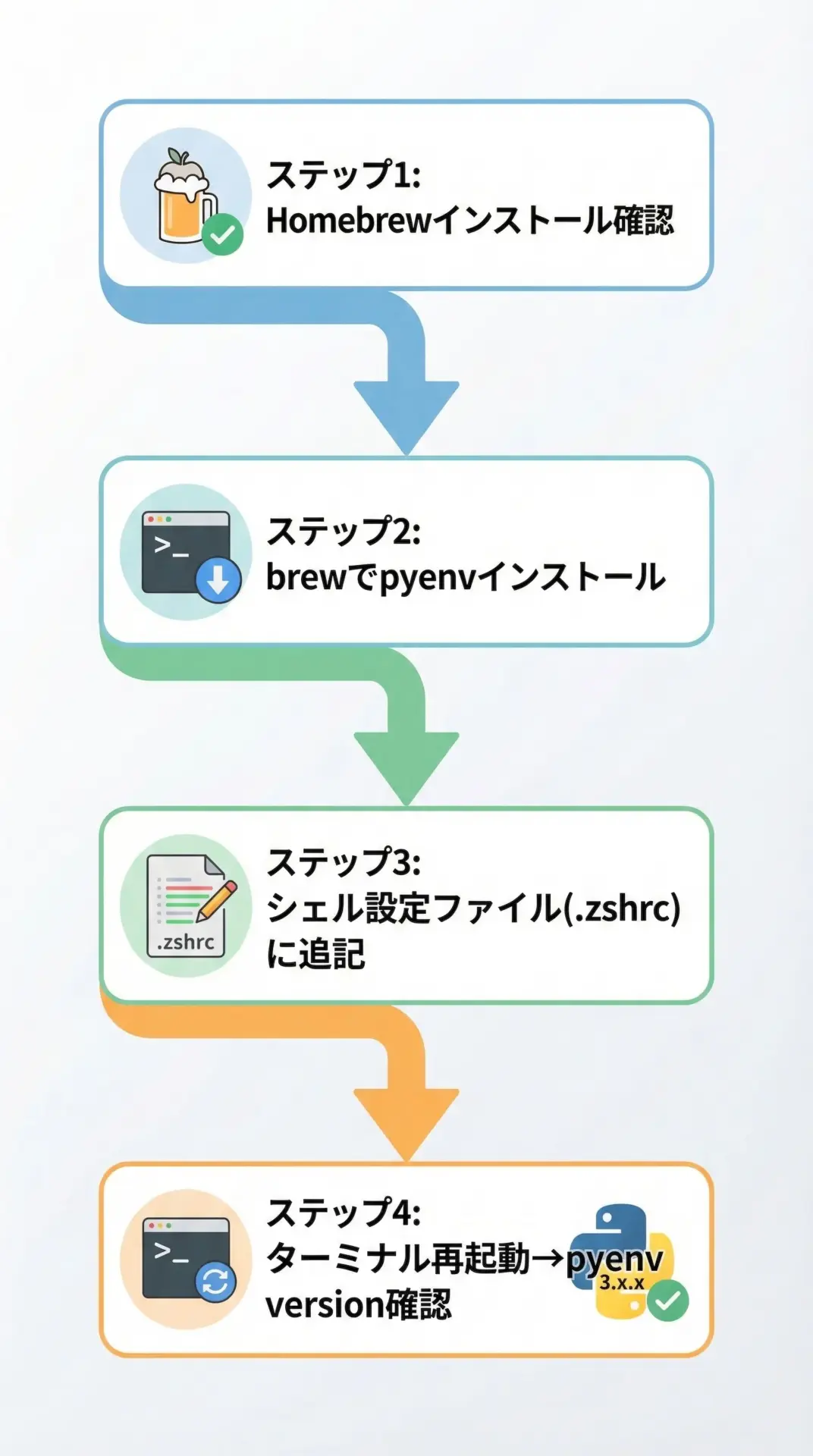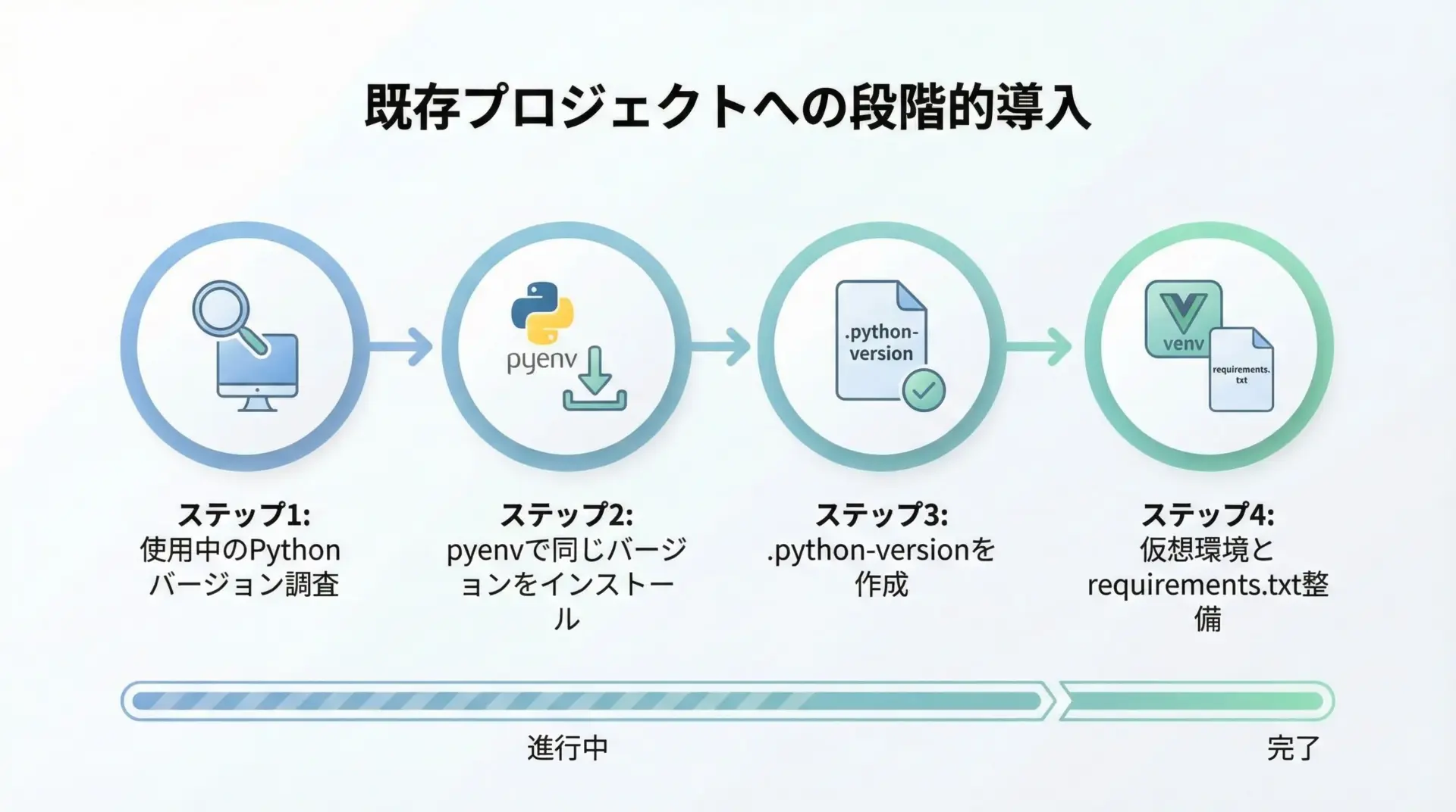 この手順を丁寧に踏むことで、本番環境と同一バージョンをローカルでも再現しつつ、徐々にpyenvへの移行を進められます。