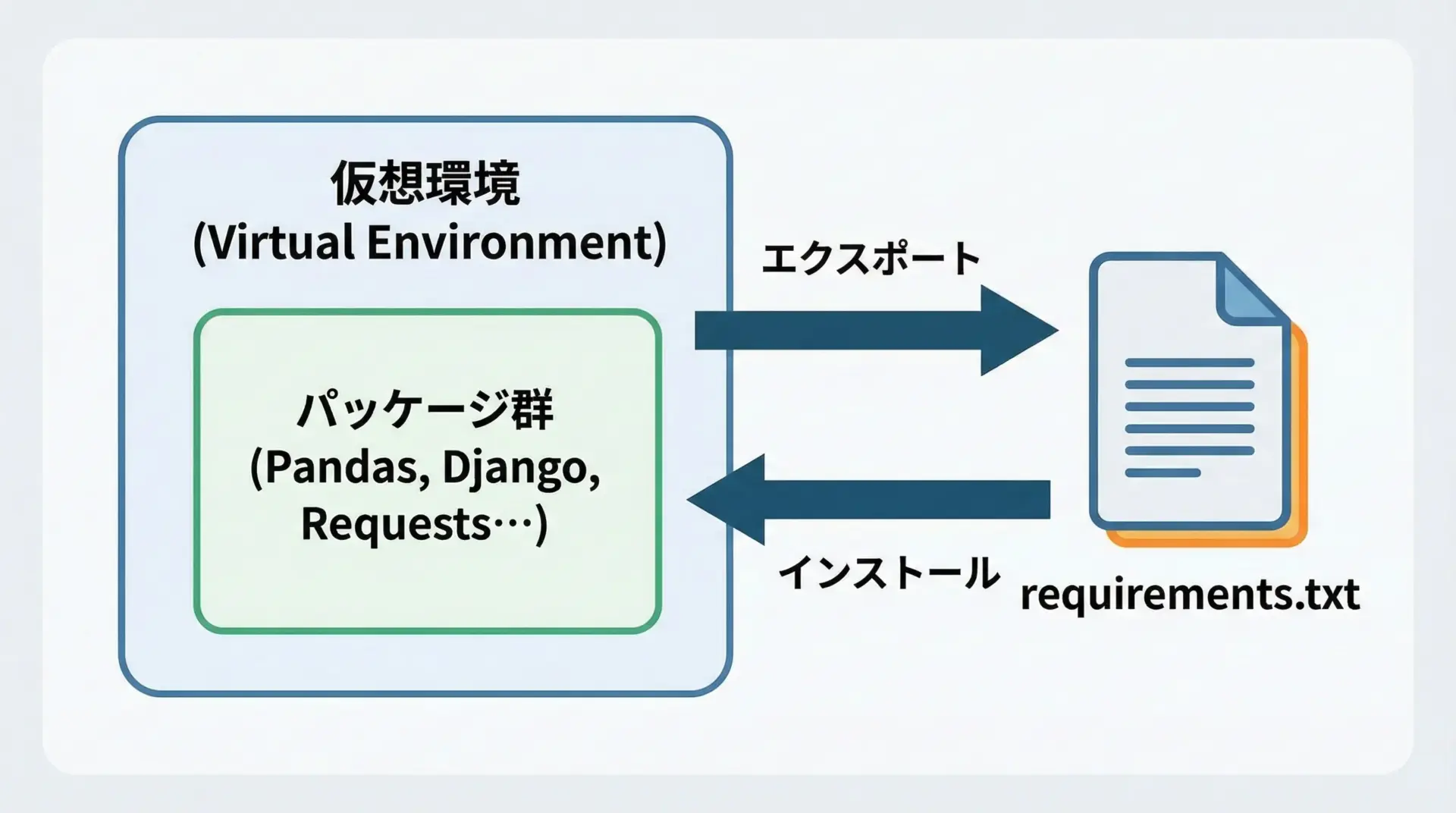 仮想環境を使う目的の1つは、依存パッケージをプロジェクト単位で管理し、再現可能な環境を構築することです。