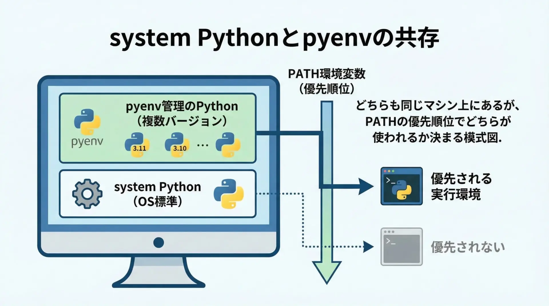 pyenvはシステムPythonを上書きせず、ユーザー領域に別途Pythonを置きます。