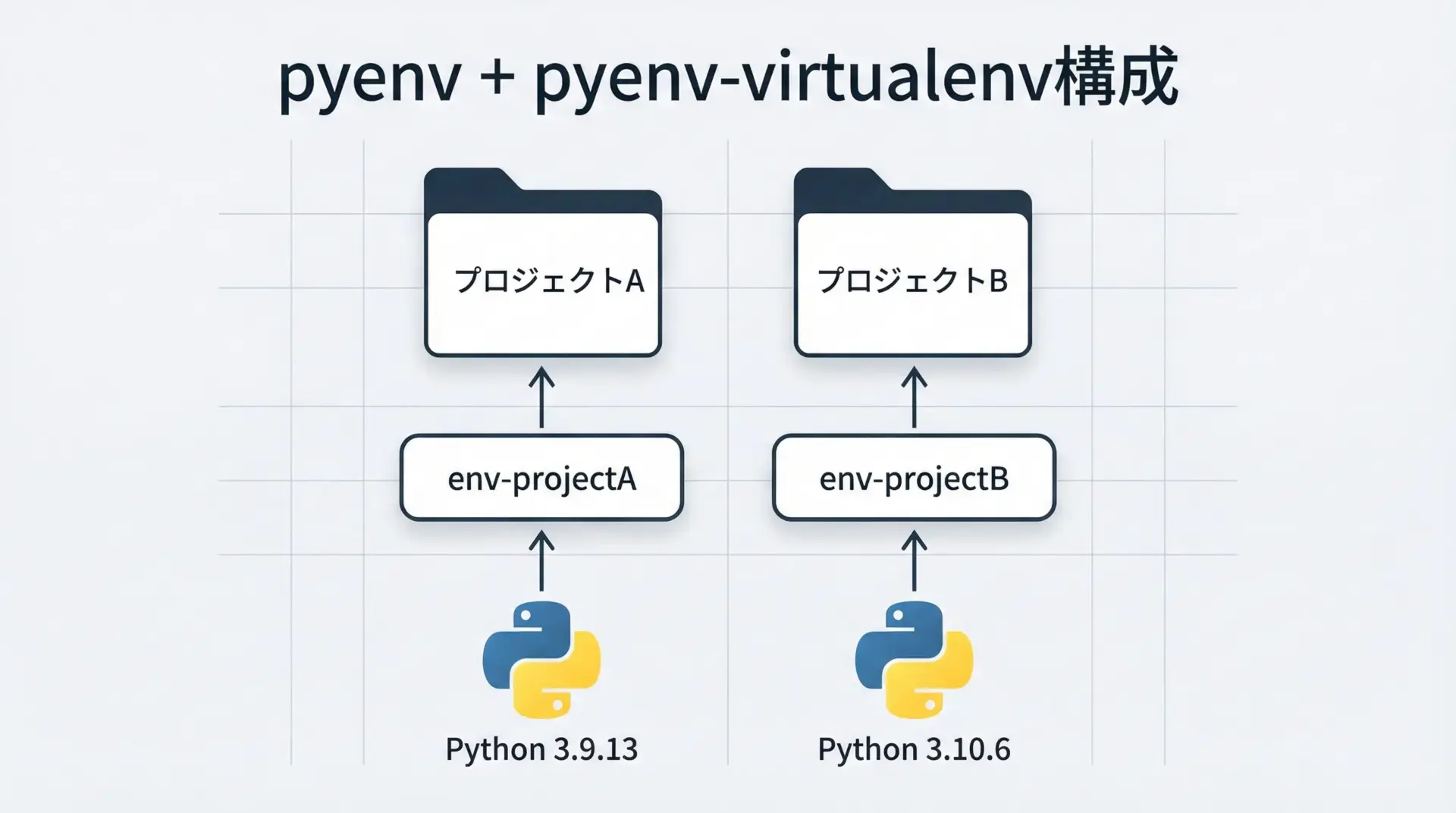 たとえば、Python 3.10.6をpyenvでインストールし、その上に「projectA」「projectB」用の2つの仮想環境をpyenv-virtualenvで作る、という構成が典型例です。