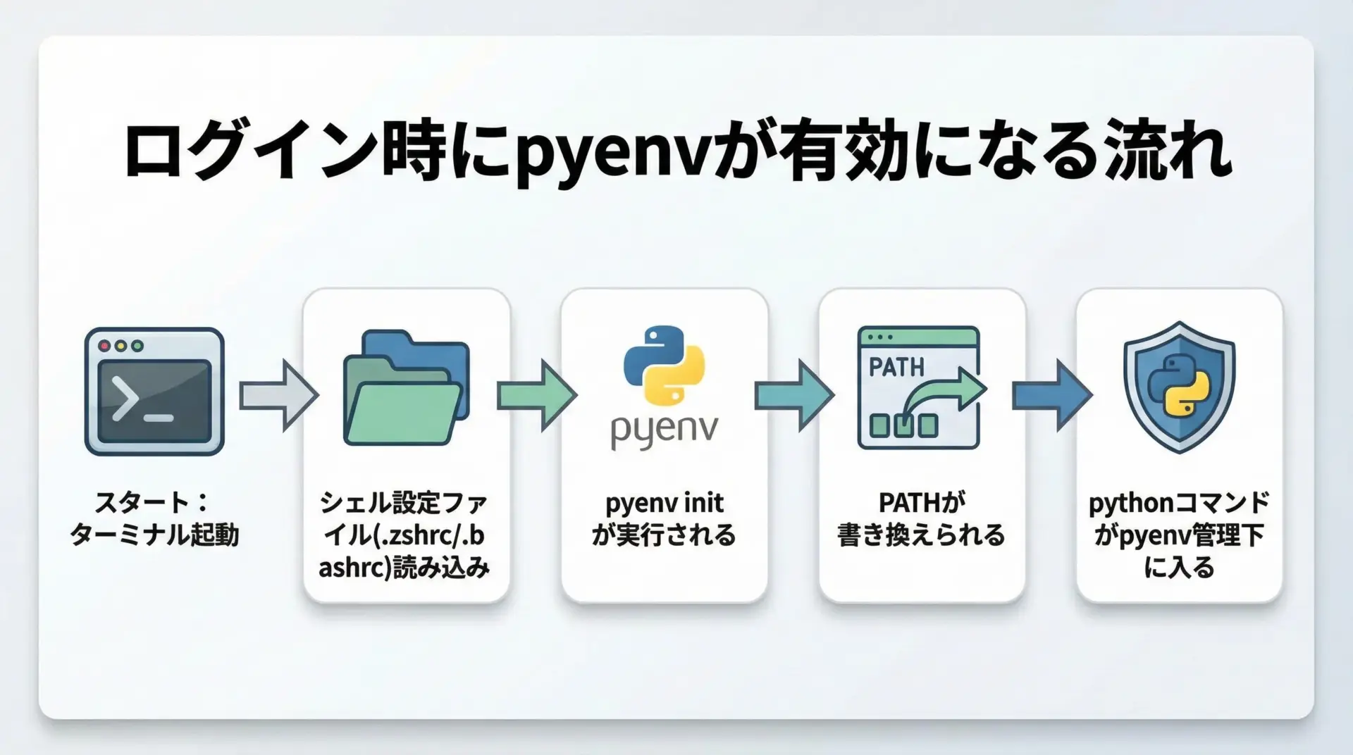 テストやアプリ起動を行い、pyenv経由でも同じように動くかを確認します。 - 問題なければ、