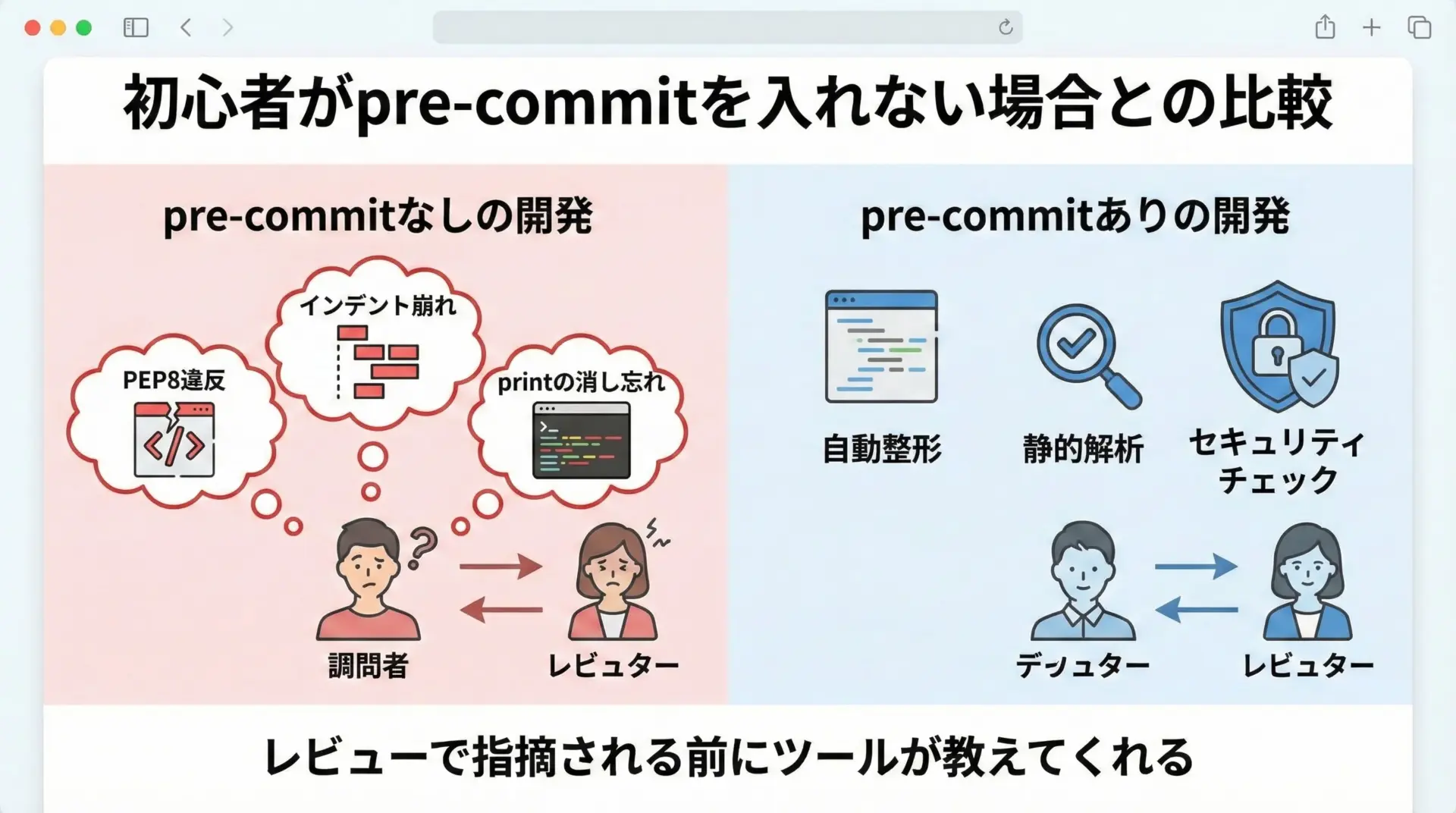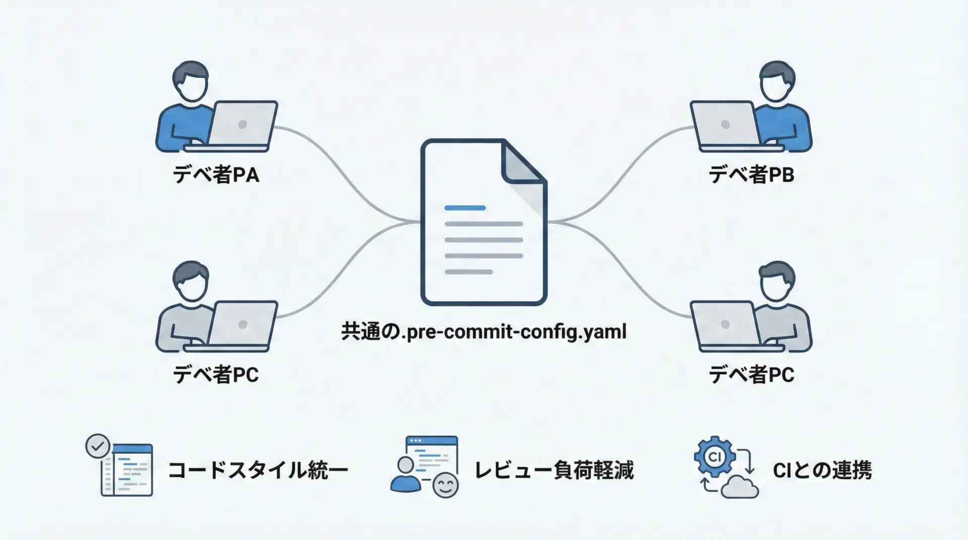 pre-commitを導入しておけば、リポジトリにコミットされた.pre-commit-config.yamlを全員が共有することで、「機械がチェックできる部分」はすべてツールに任せることができます。