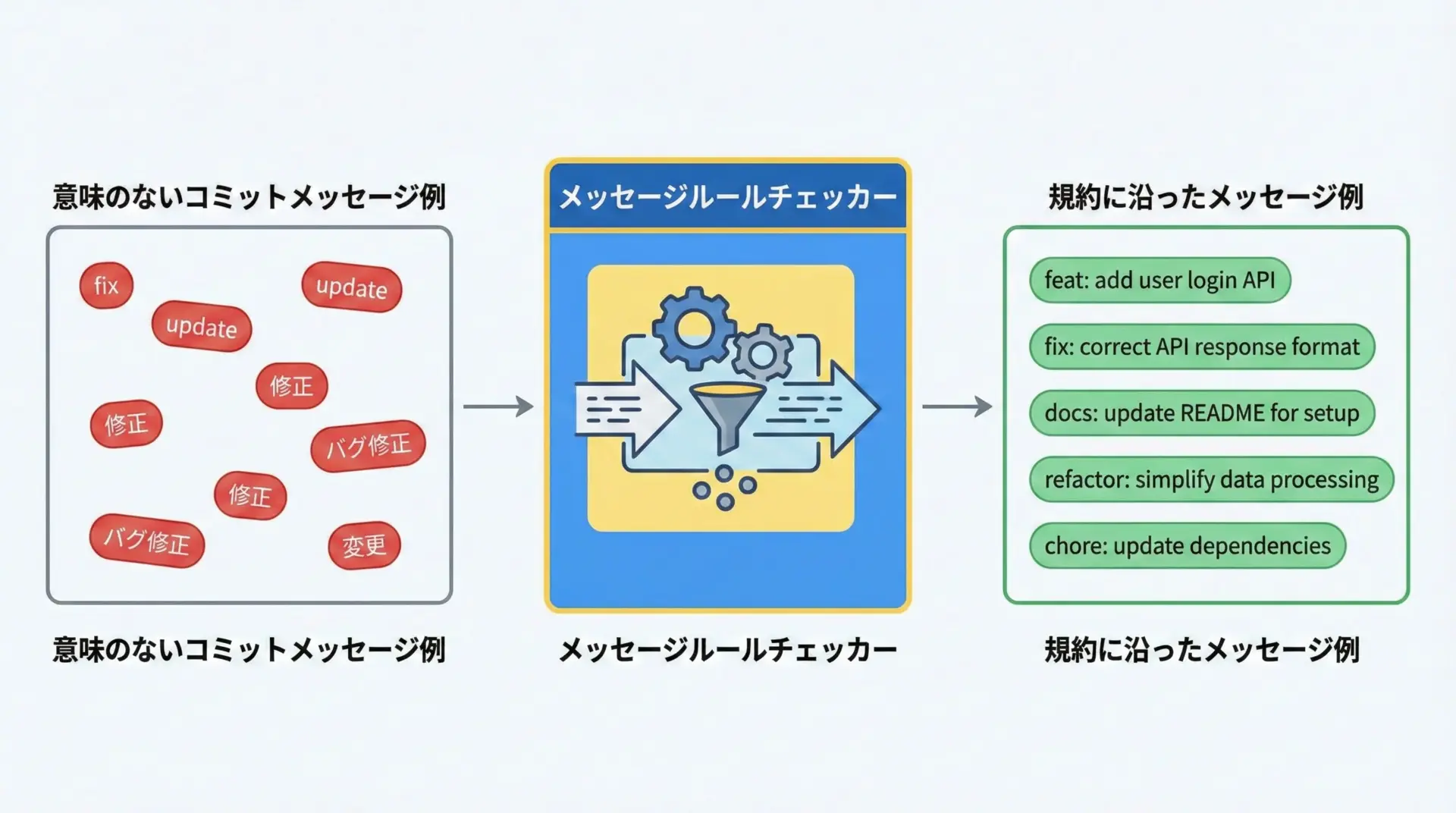 コミットメッセージにもルールを適用することで、履歴が読みやすくなります。
