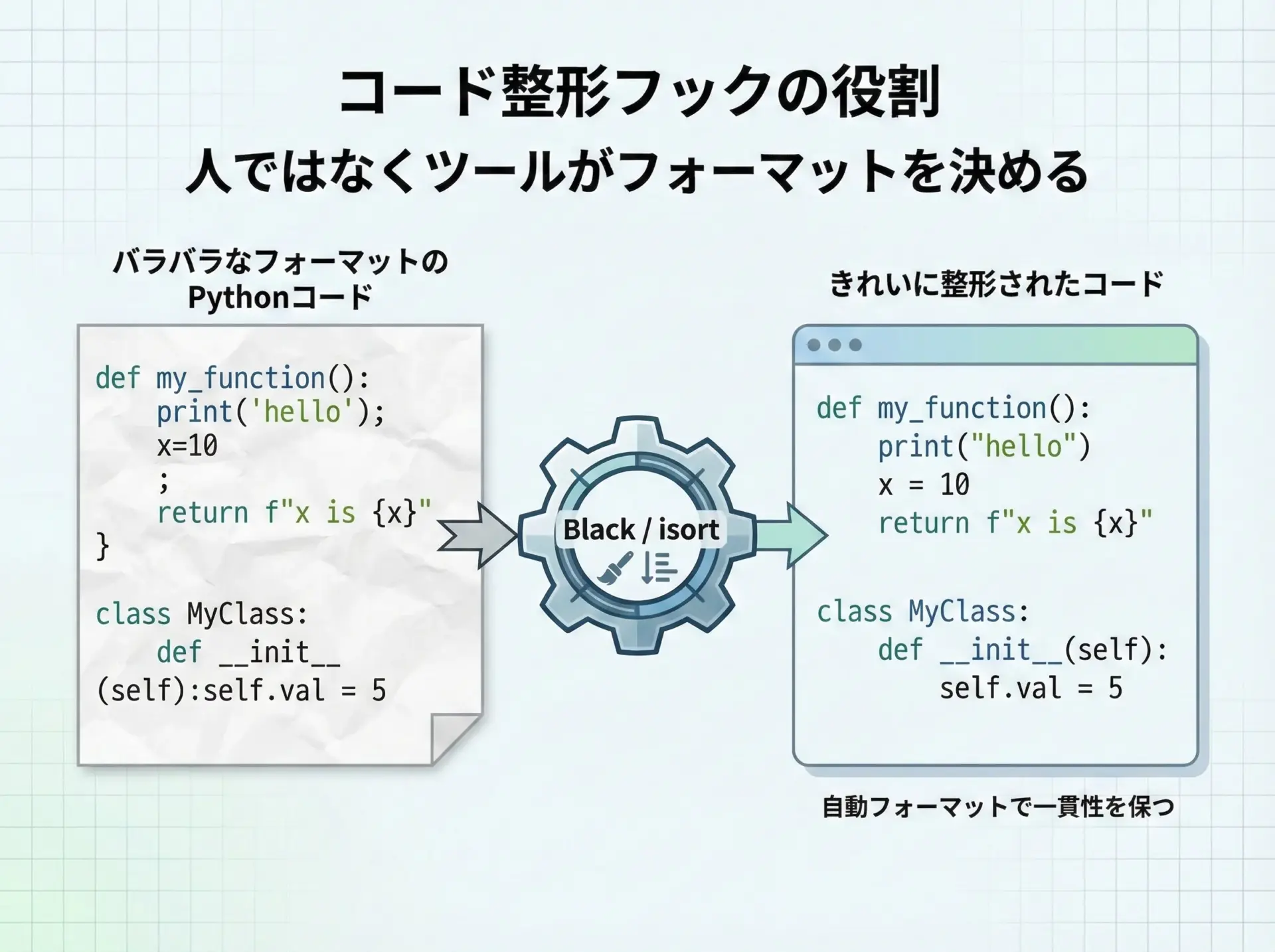 ここまで紹介したフックを組み合わせて、Python初心者〜小規模チームで使いやすい構成例を示します。