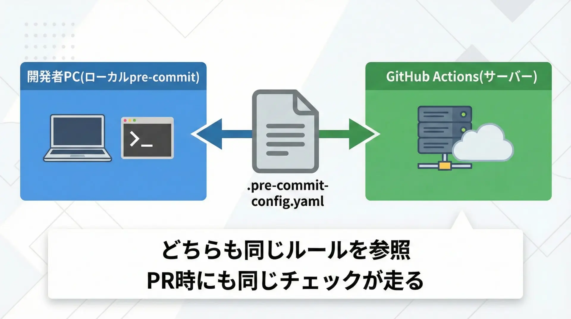 ローカルだけでpre-commitを使っていると、開発者がpre-commit installし忘れる場合や、CIでは別のチェックが走っているといった不整合が起きることがあります。