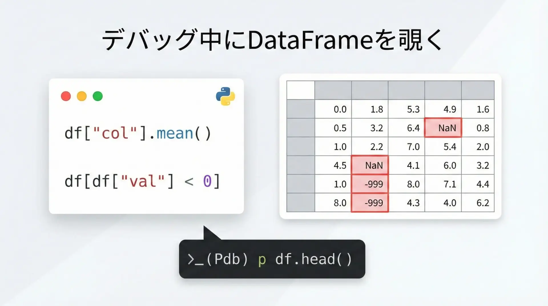 このように、pdbの中でもほぼ通常のPython REPLと同じ感覚で操作できるため、辞書やクラスインスタンス、PandasのDataFrameなど、どんなオブジェクトでも一貫した手つきで調査可能です。