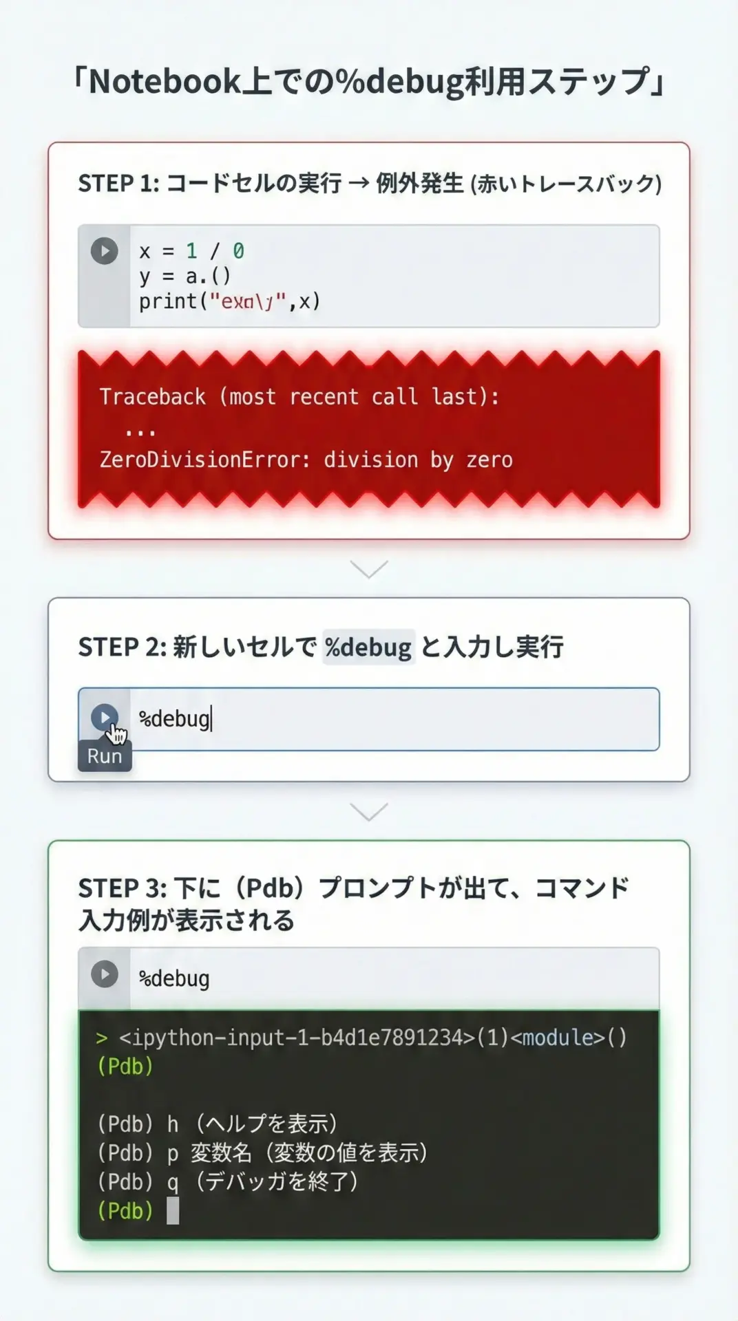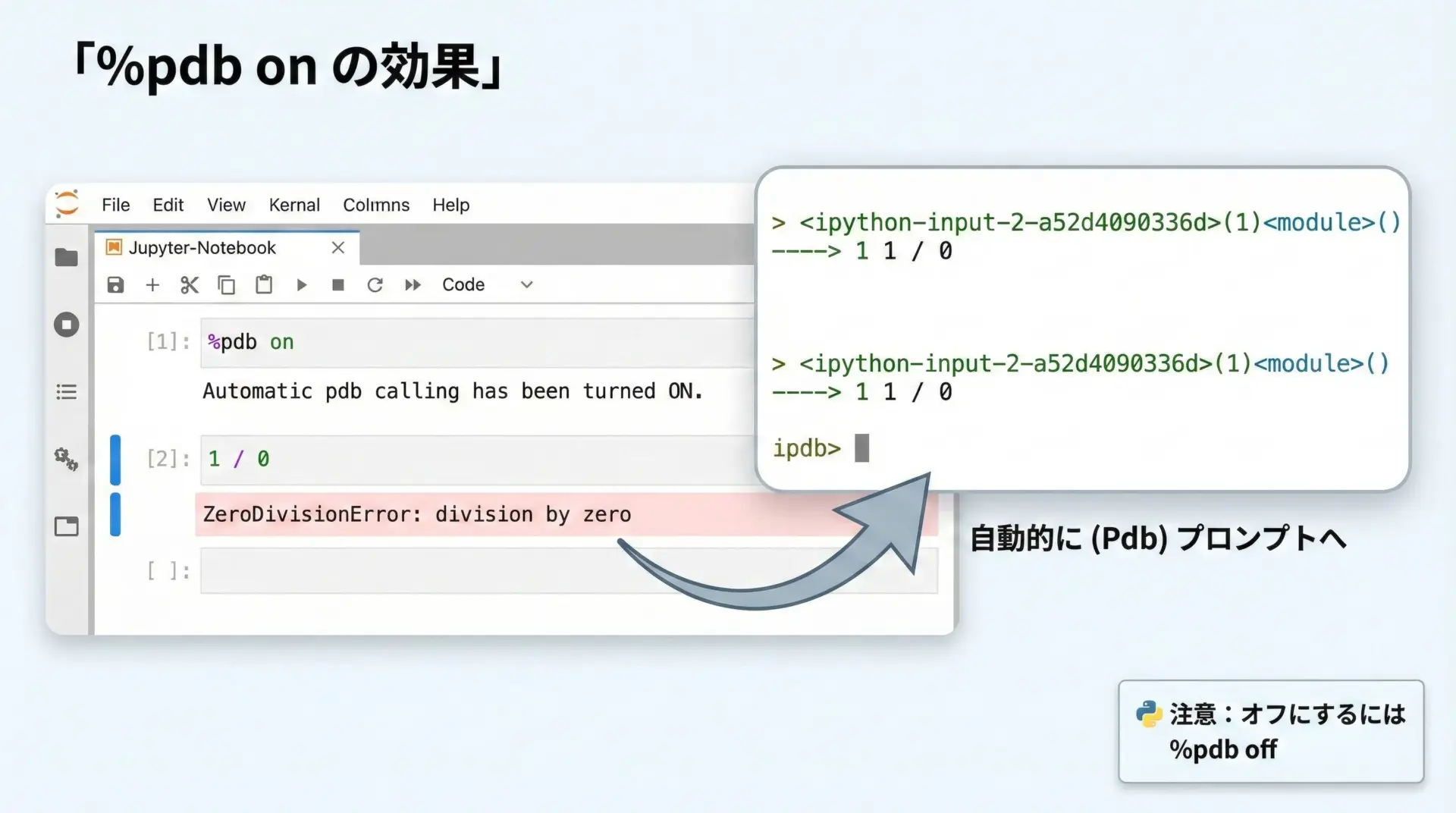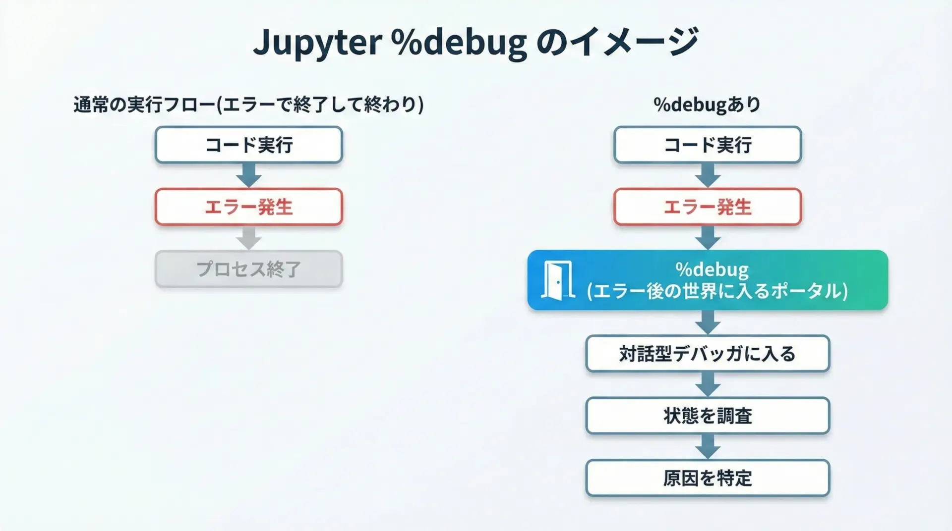 このように、Jupyterの%debugは、Notebook上で手軽にpdbを呼び出すための「マジックなショートカット」と考えると理解しやすくなります。
