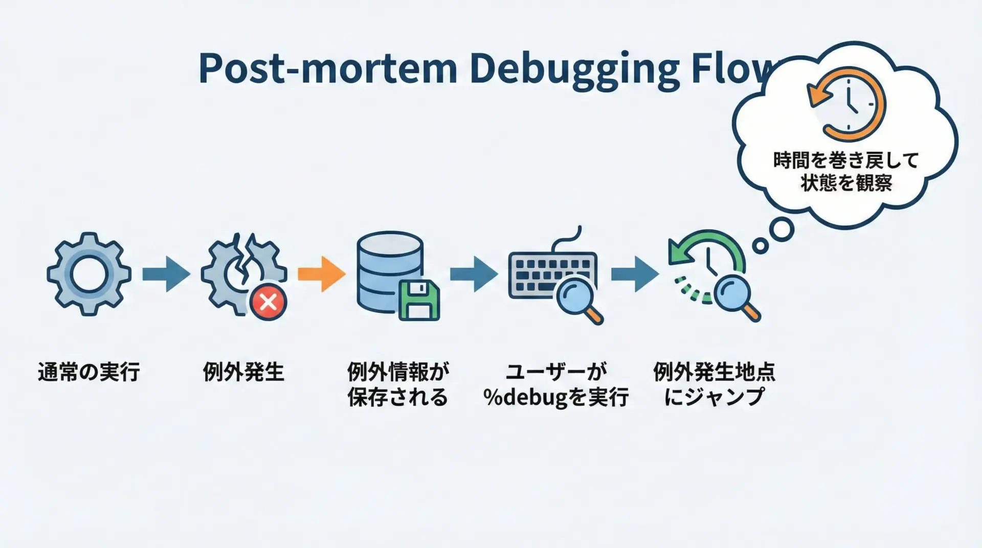 Jupyterの%debugマジックコマンドは、エラーが出た直後の世界に飛び込んで、コードの流れや変数の状態を対話的に調べられる強力なデバッグ手段です。