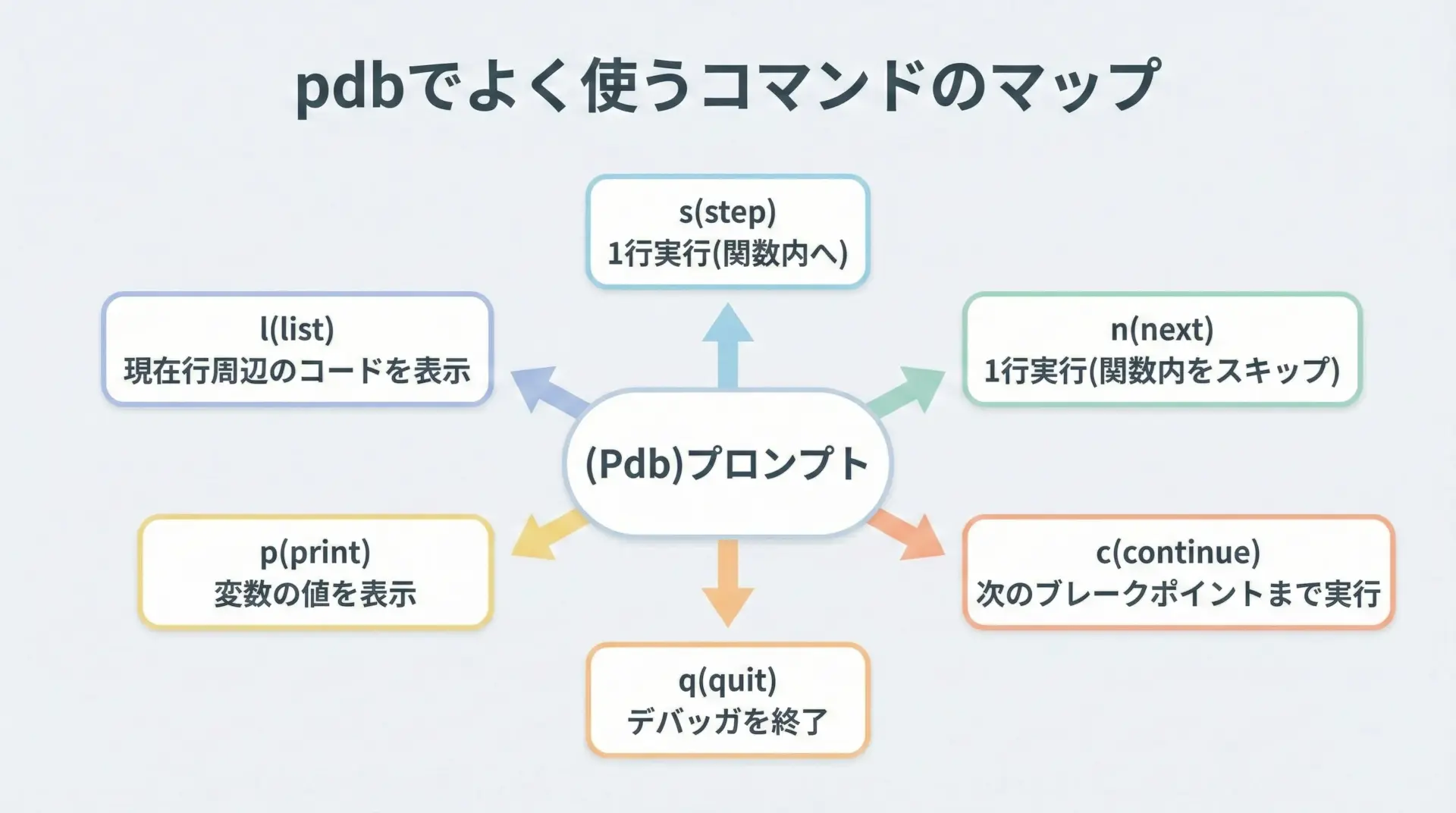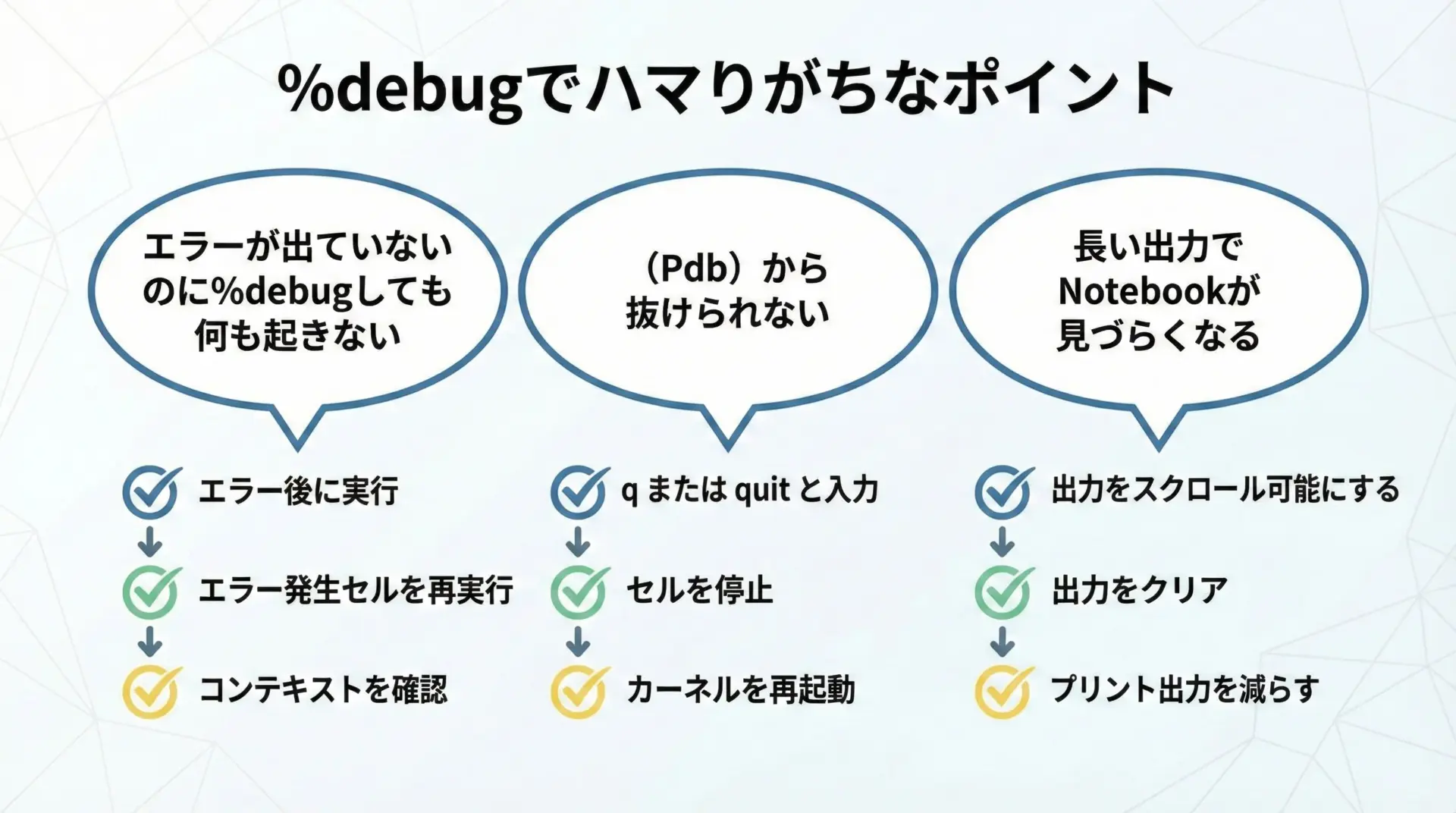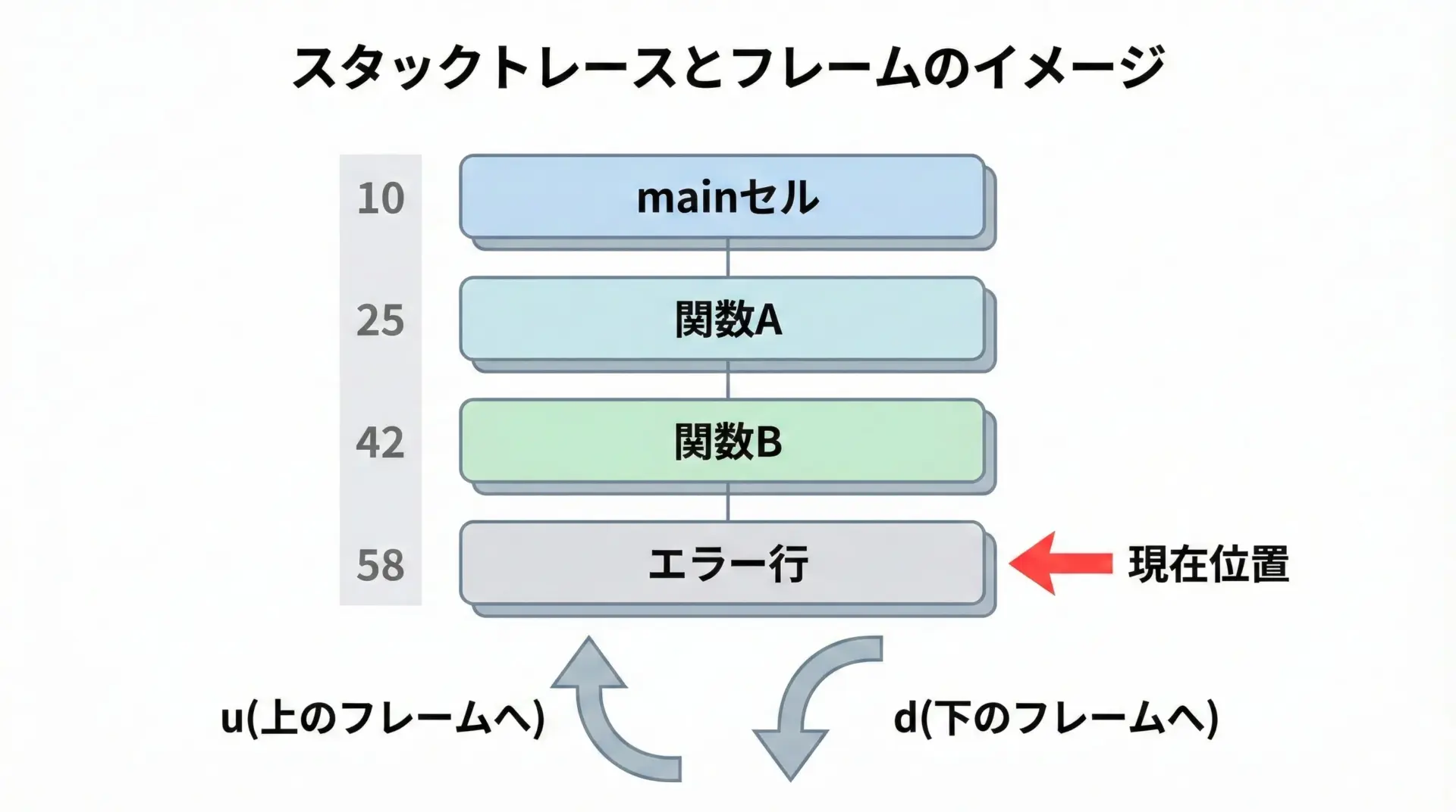 エラー発生後に%debugでpdbに入り、l・p・w・uといった基本コマンドで「どの行で」「どんな値で」「どこから来て」止まったのかを確認するだけでも、多くのバグは素早く特定できます。