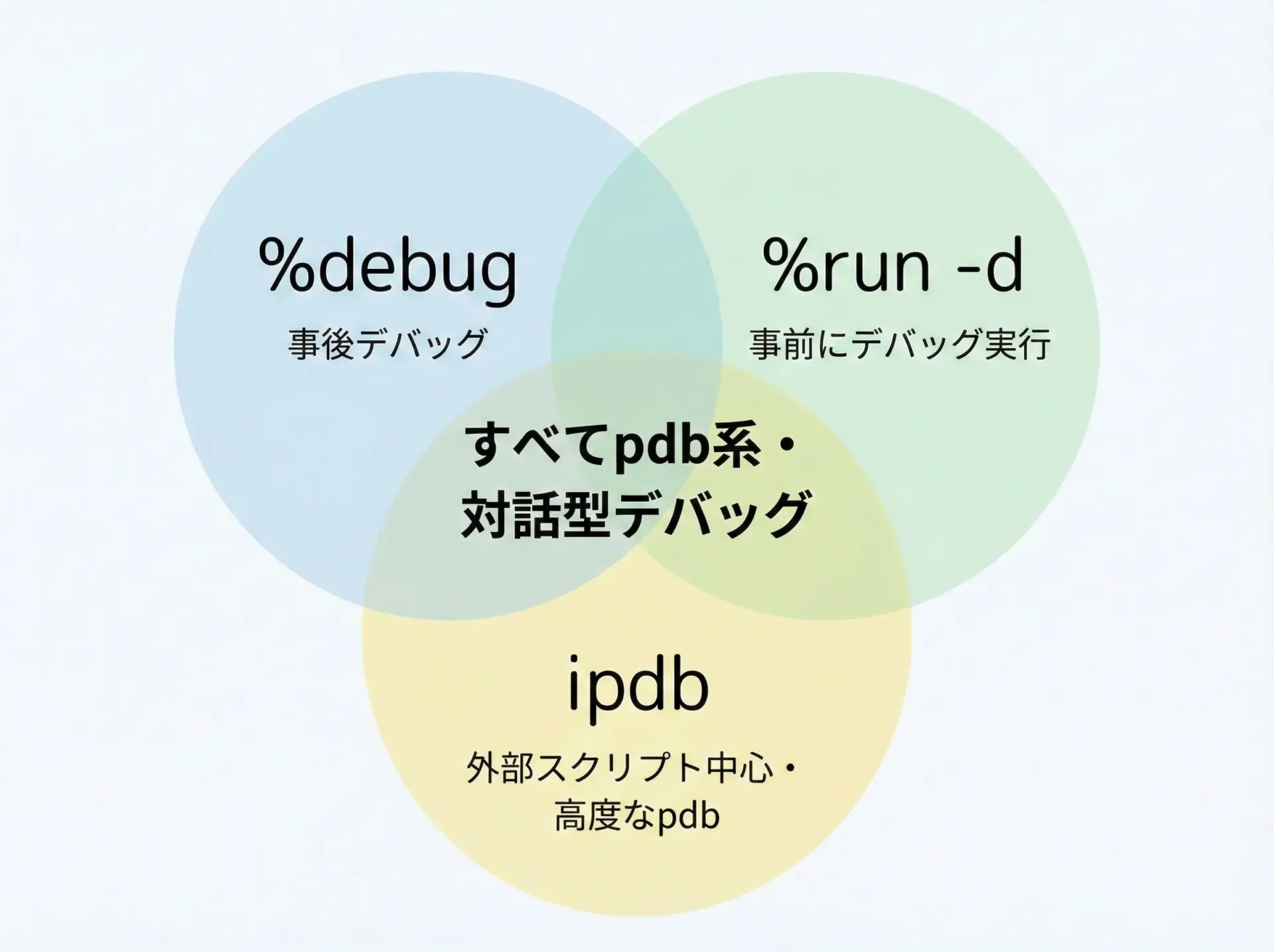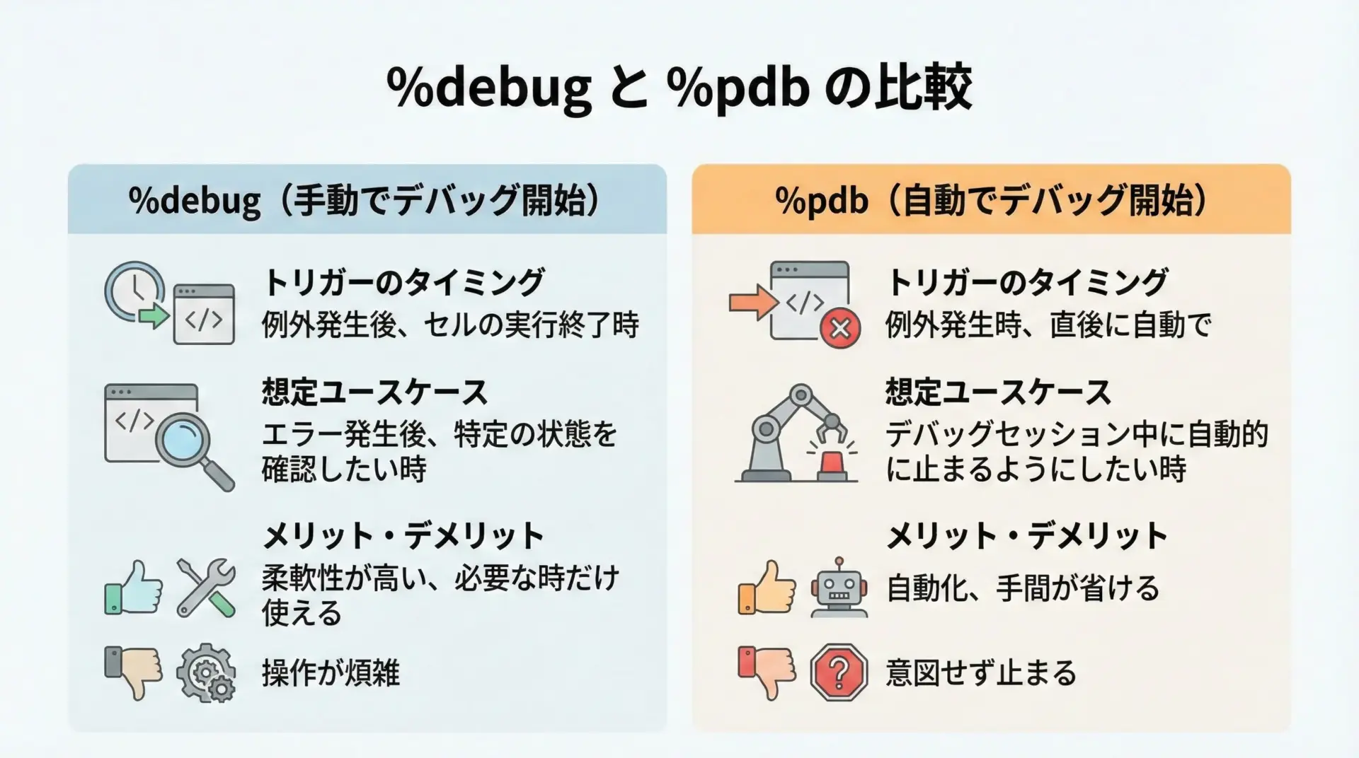 日常的な開発では、まず%debugを基本ツールとして使い、デバッグフェーズに入ったら%pdbをオンにして自動で落ちるようにするという使い分けが実用的です。