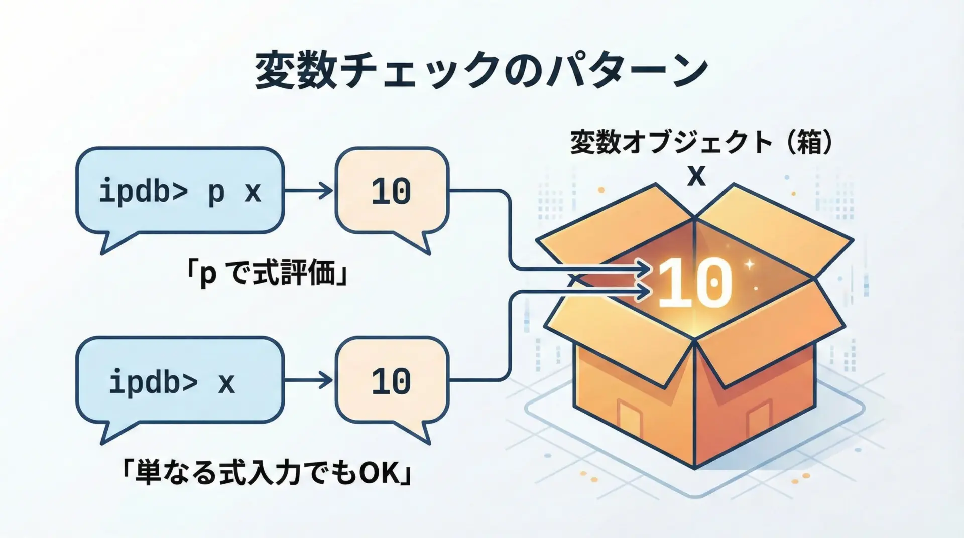 pdbでは主にpコマンドを使いますが、実はpを付けずにそのまま式を書いても評価されます。
